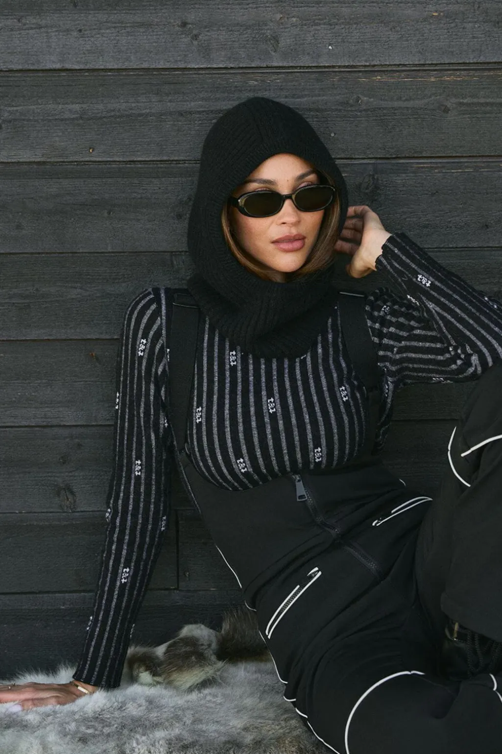 Sort balaclava fra Twist & Tango med ribbet tekstur og omfattende hoveddækning. Den har en løs pasform og er lavet af en blanding af babyalpaka.