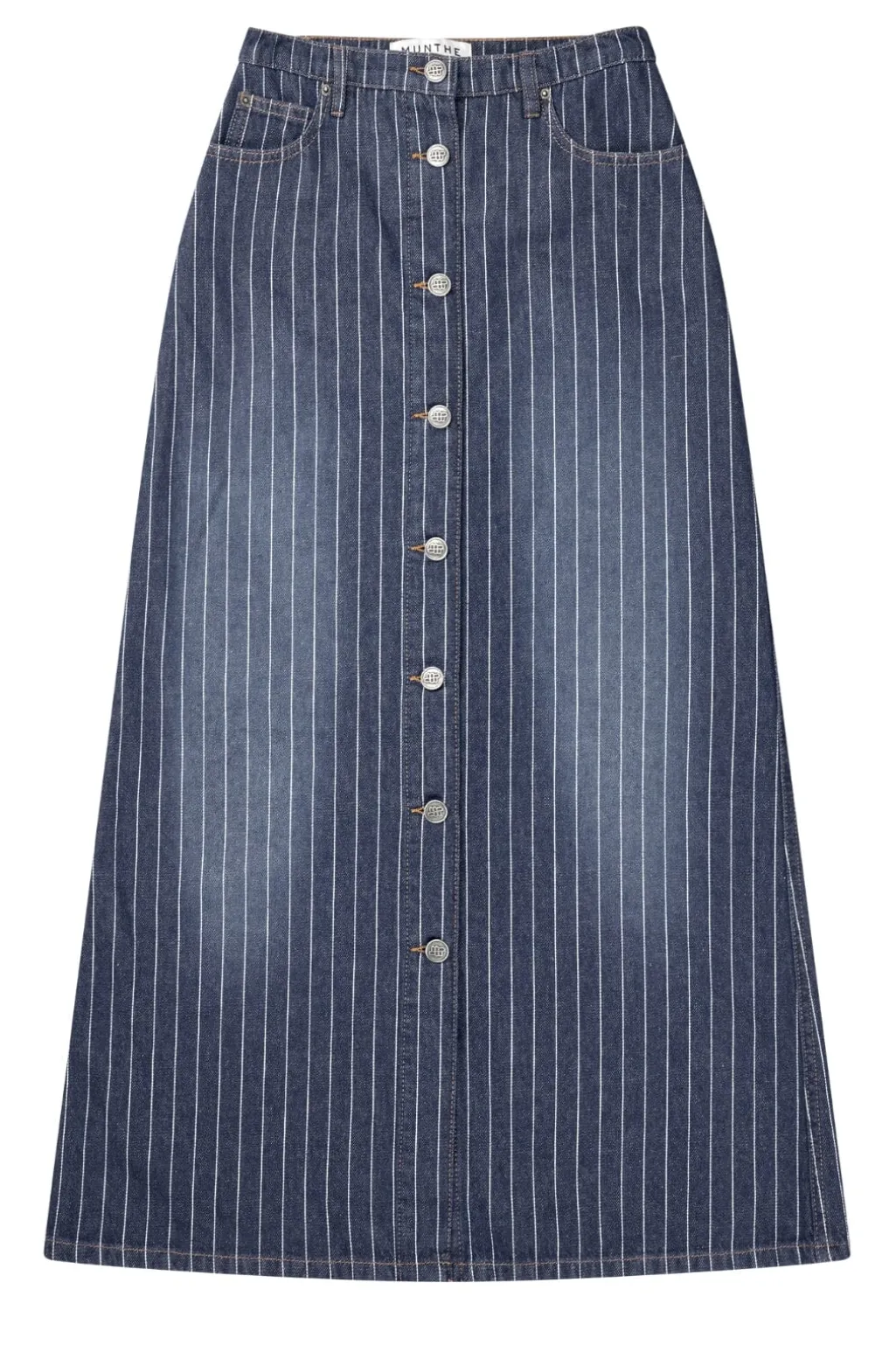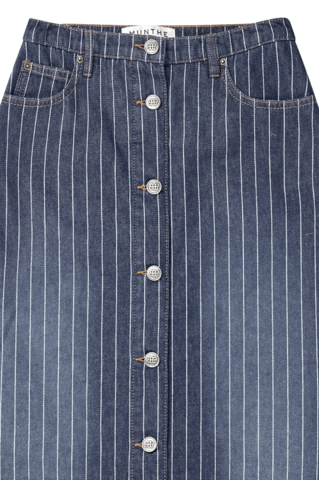 Indigo-nederdel fra Munthe i stribet denimstof med høj talje. Den har knaplukning foran og praktiske forlommer. Dekorative syninger giver nederdelen et rustikt præg.