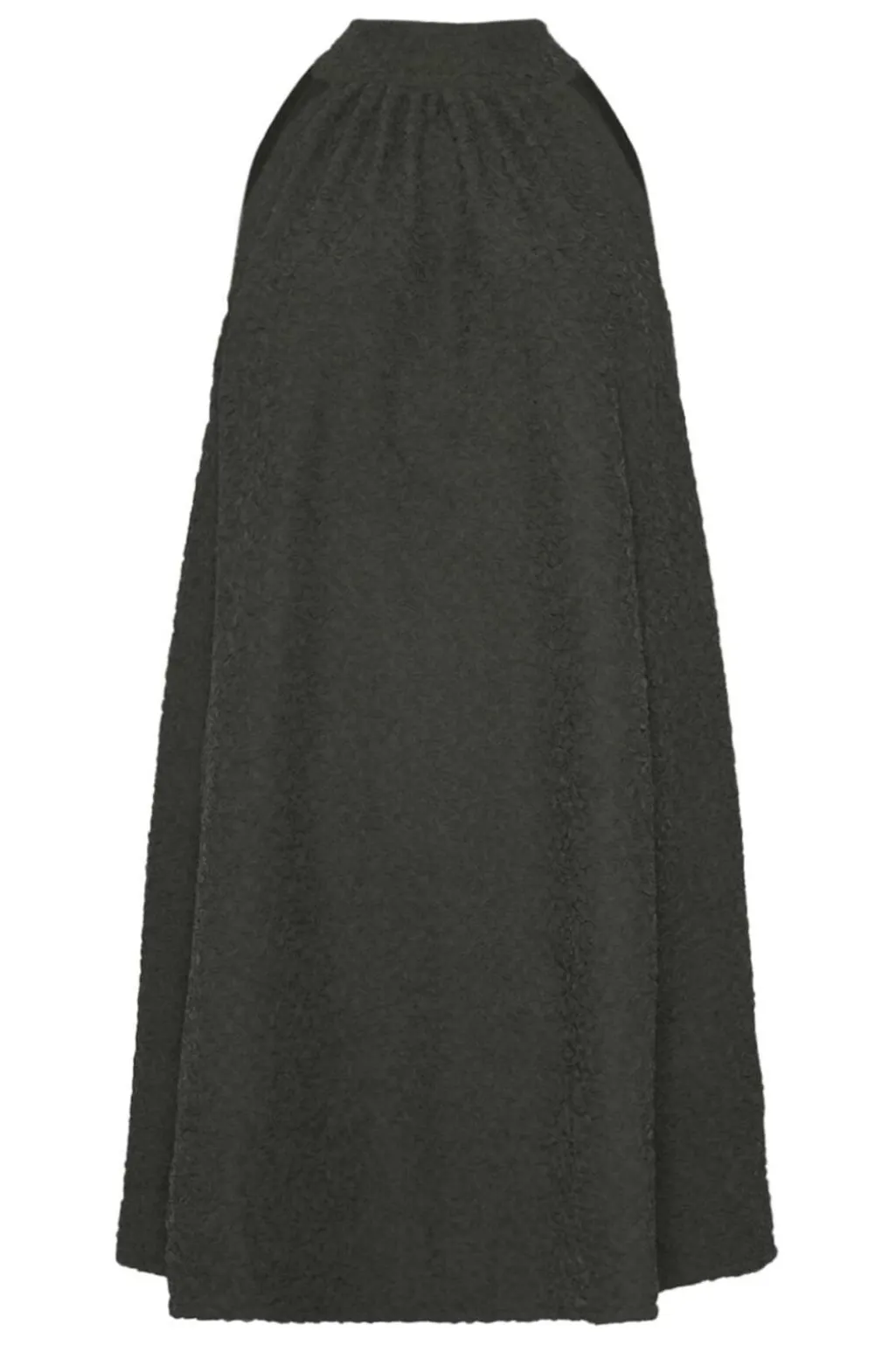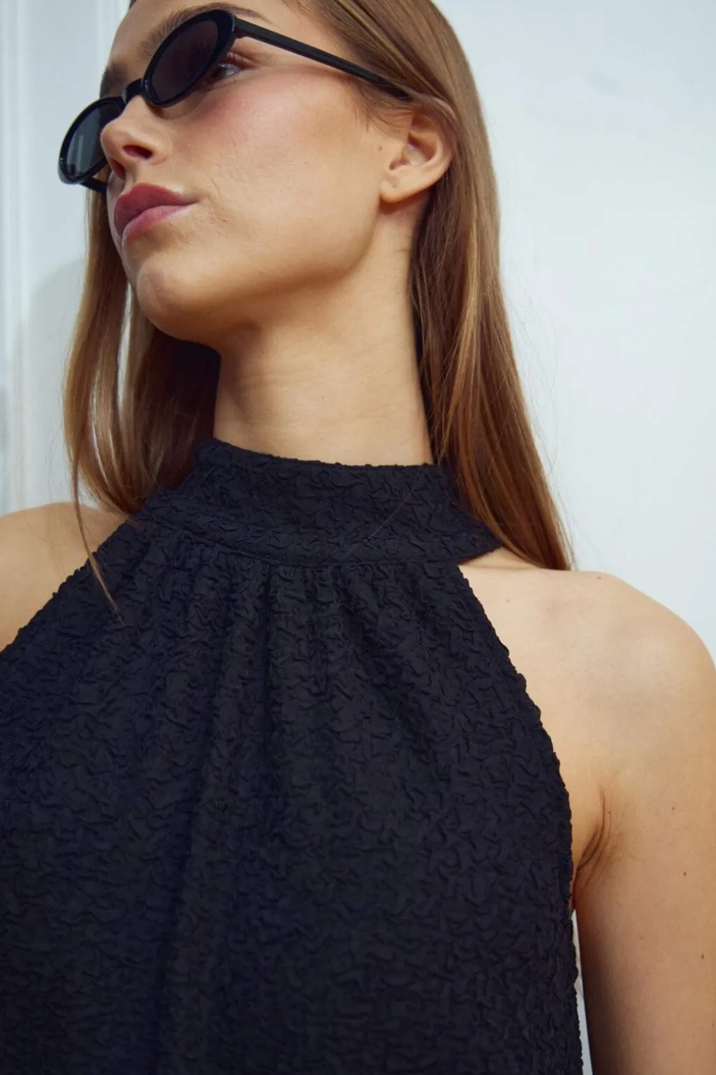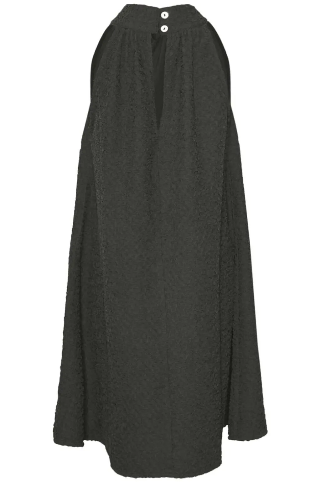 Sort kjole fra Noella med en struktureret overflade og høj halsudskæring. Kjolen har bindebåndsdetaljer og en løs A-formet silhuet.