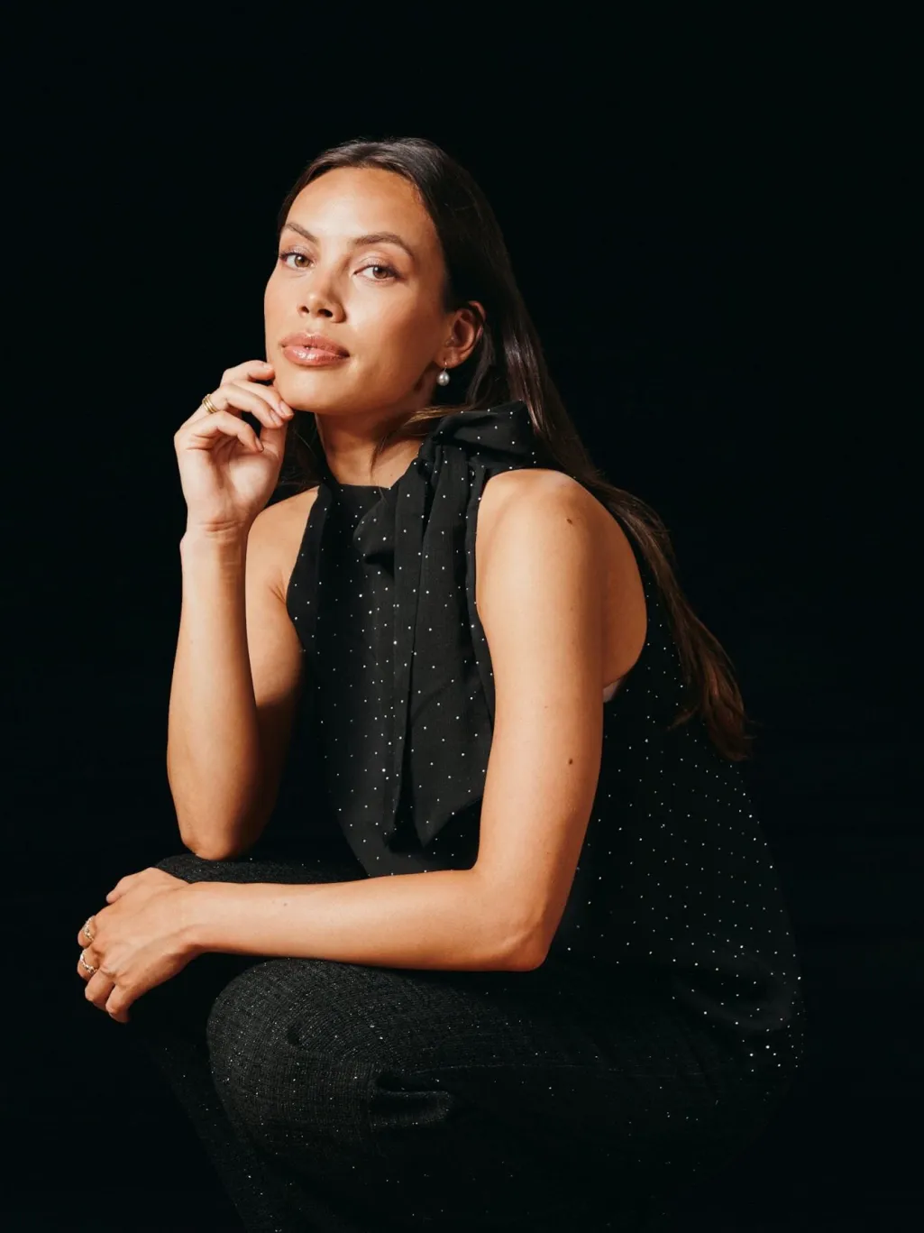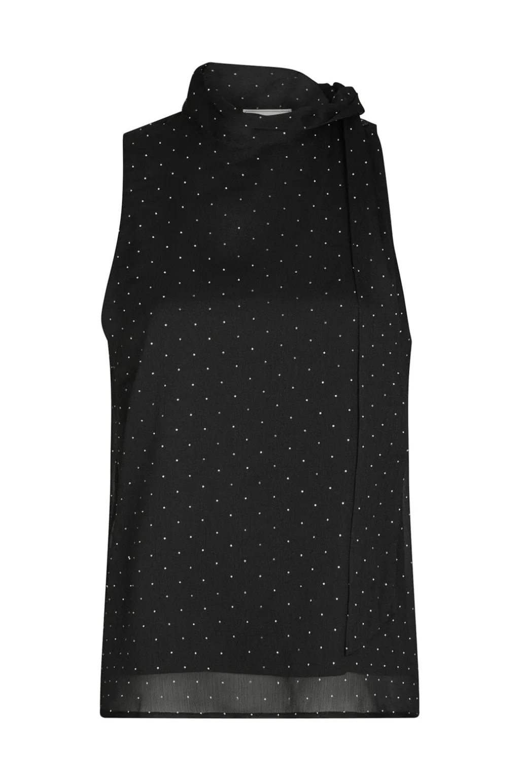 Sort top fra Neo Noir med hvide prikker og høj hals. Toppen har en løs pasform og er lavet af chiffon med påsyede sten og bindebånd ved halsen.