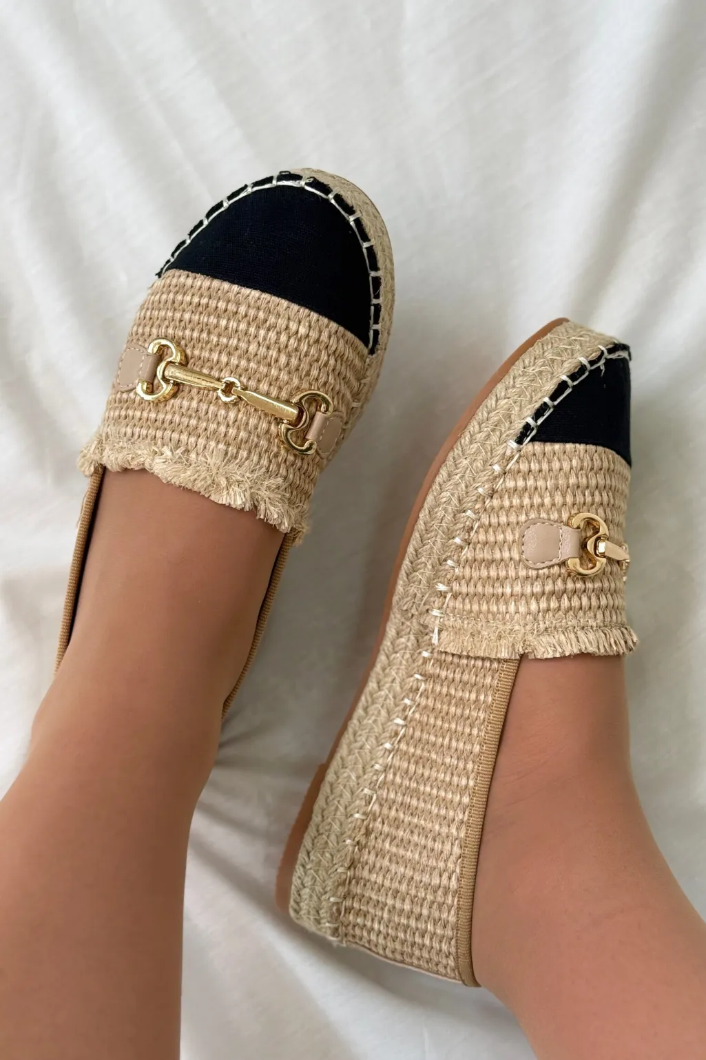 Sandal fra Bloom i camel-nuance med sort tå og guldfarvet metalspænde. Den flettede tekstur og kombinationen af farver gør den nem at style til forskellige outfits.