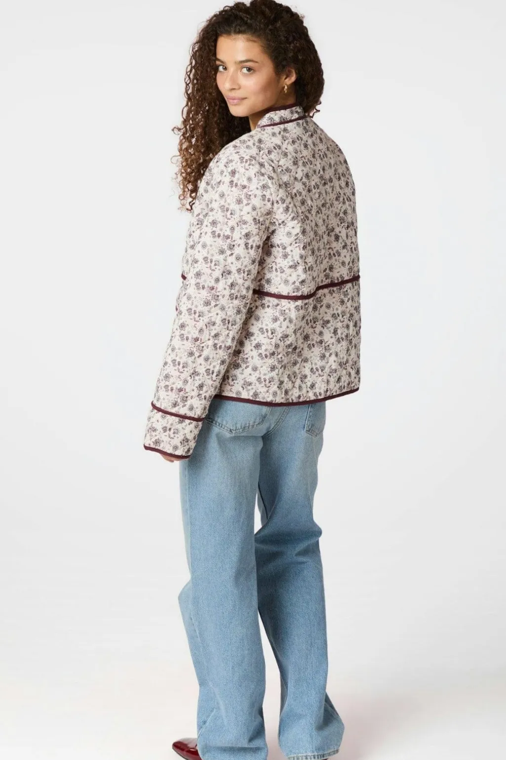 Quiltet jakke fra Neo Noir med blomstermønster i bordeaux og rosa nuancer. Jakken har dekorative syninger, rund hals og lange ærmer med bordeauxfarvet kantbånd.