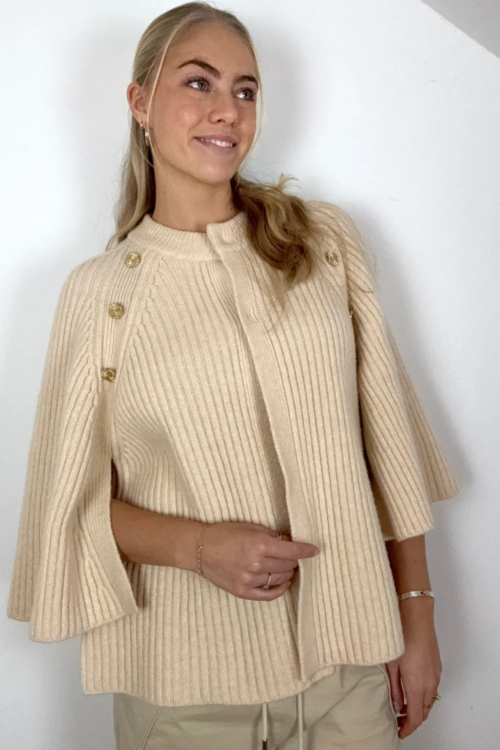 Ribstrikket kappe fra Continue i lys sandfarve. Kappen har knapper ved skulderen og brede, løse ærmer med ribstrikket tekstur.