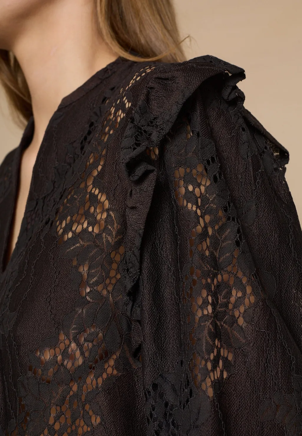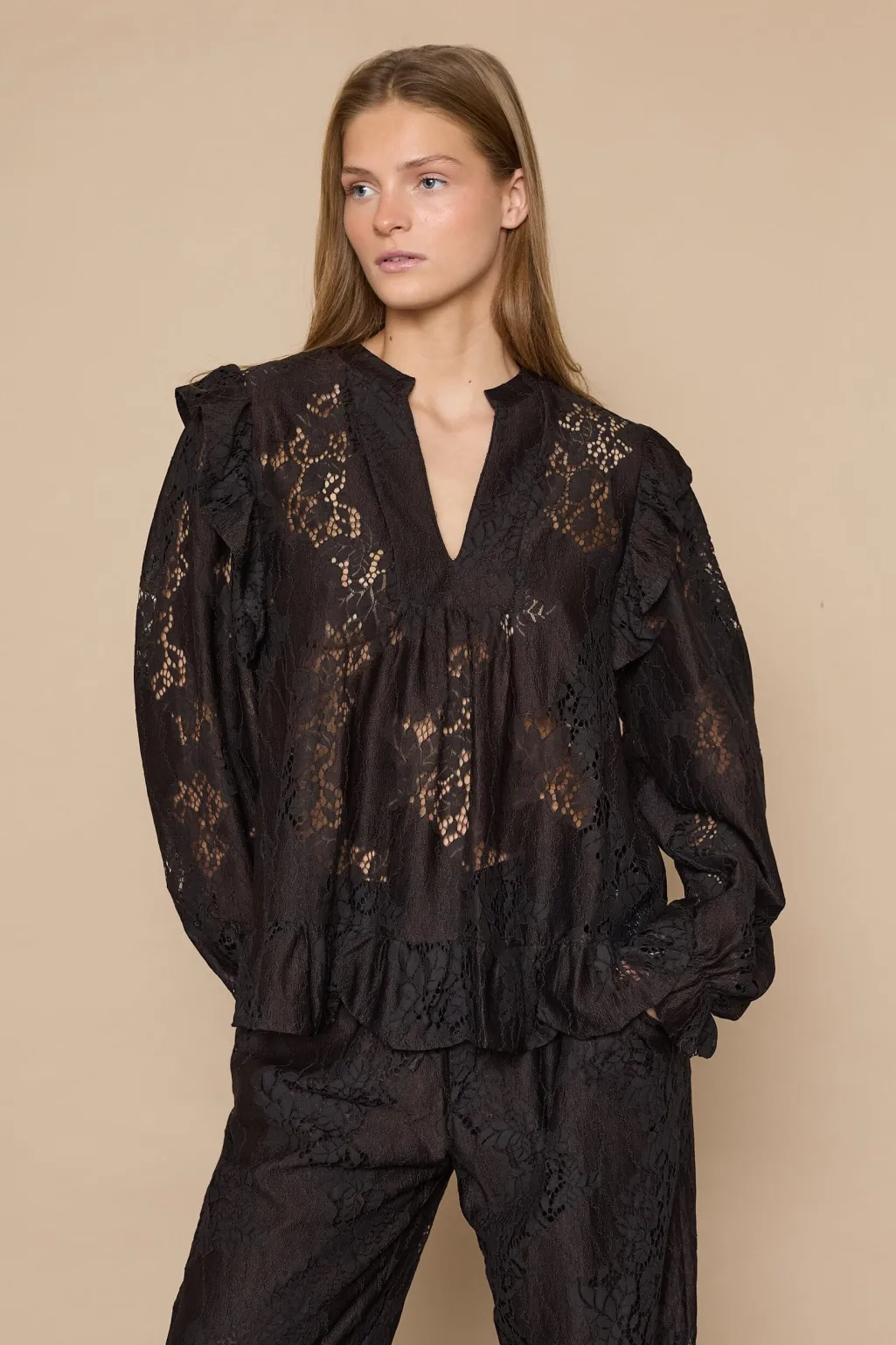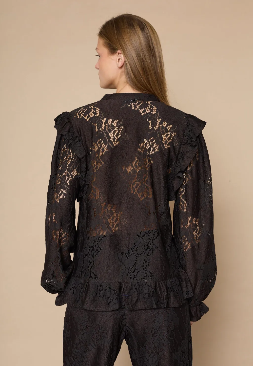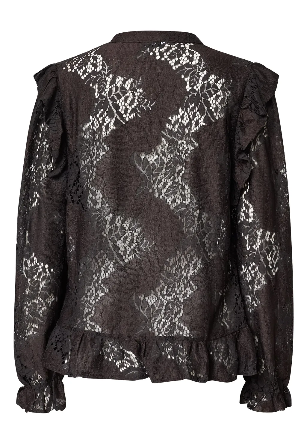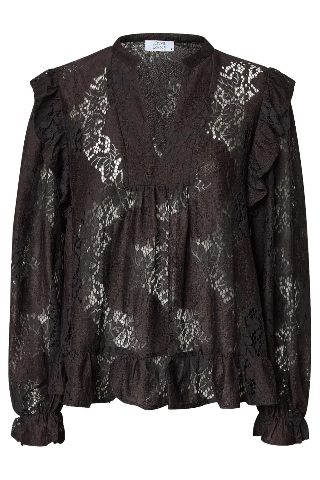 Bluse fra Love & Divine i mørk chokoladebrun med gennemsigtigt, blomstret blondemønster. Blusen har flæsedetaljer ved skuldrene og manchetterne.