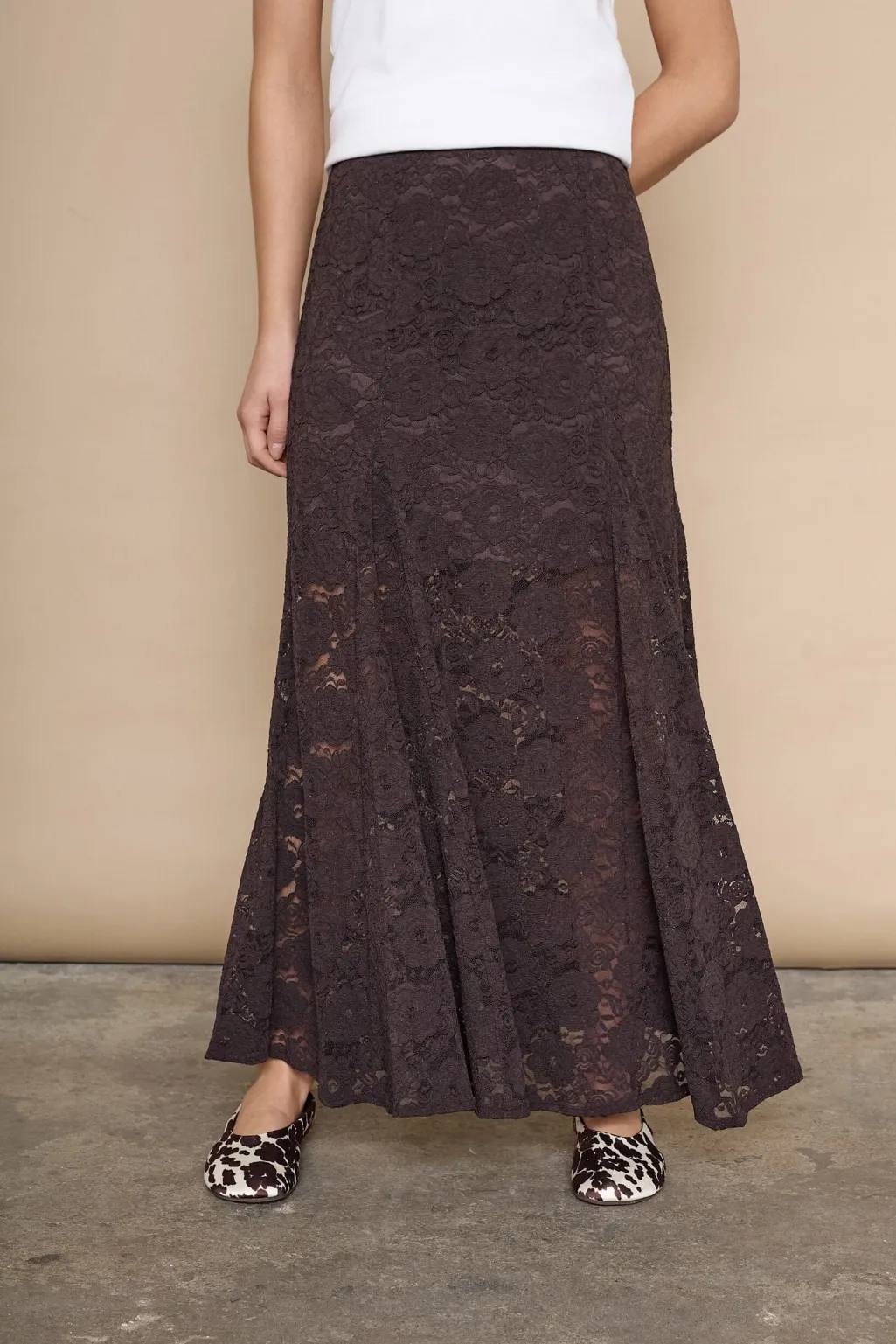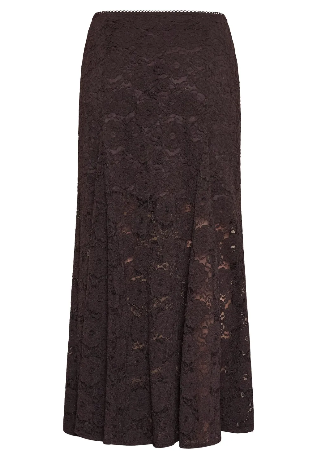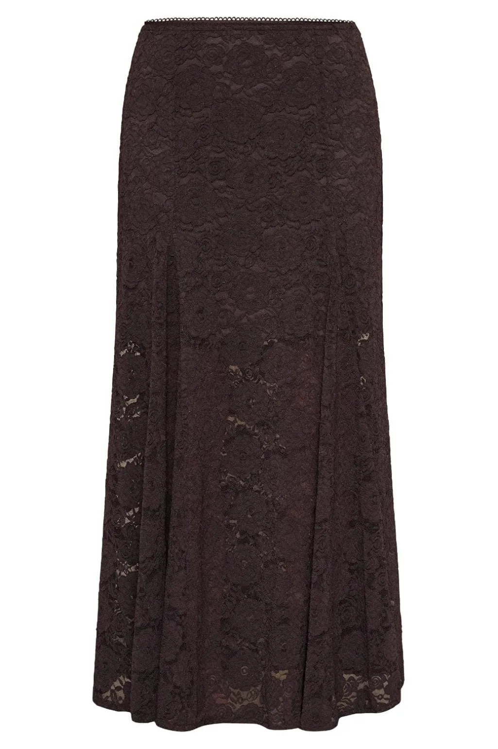 Brun blondenederdel fra Love & Divine. Nederdelen har et blomstret blondemønster og går til midt på læggen. Stoffet er let gennemsigtigt og har en A-form.