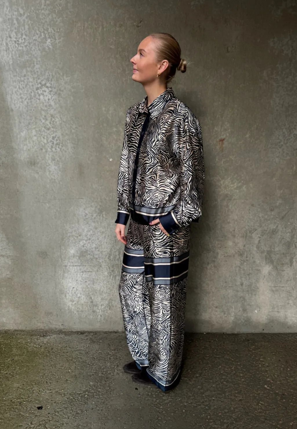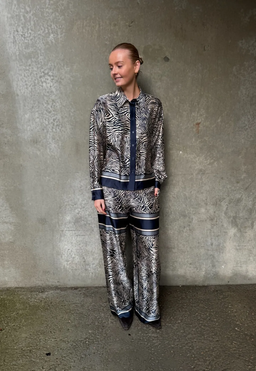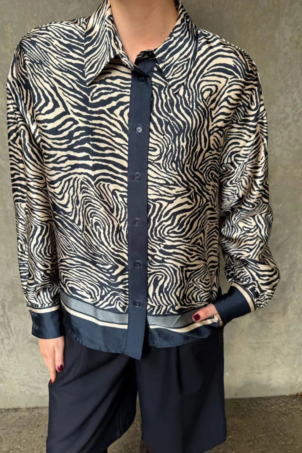Skjorte fra Love & Divine med zebraprint i mørkeblå og beige nuancer. Skjorten har en klassisk krave og knaplukning ned langs fronten.