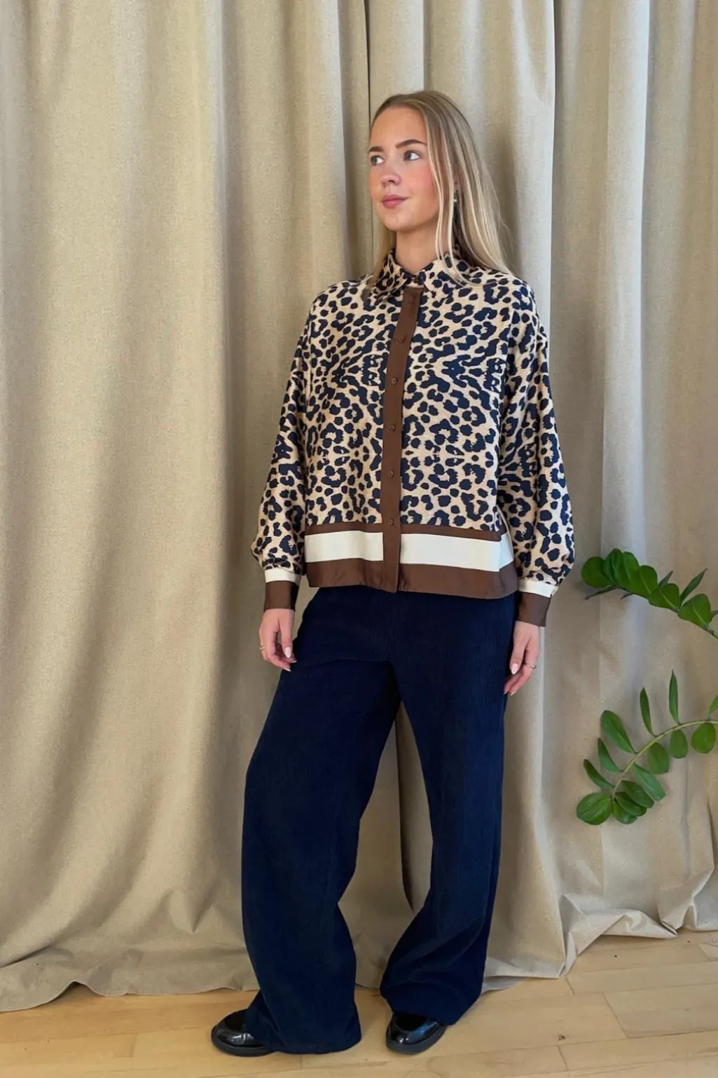 Skjorte fra Love & Divine med leopardprint i brune nuancer kombineret med navy og brune detaljer. Skjorten har en klassisk krave og knaplukning.