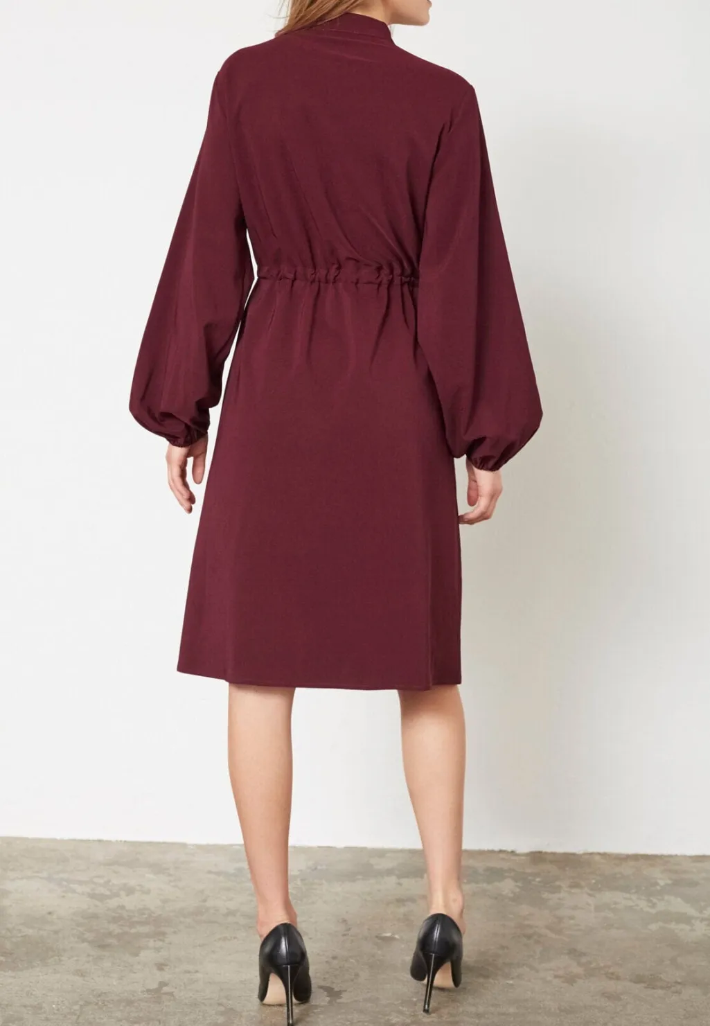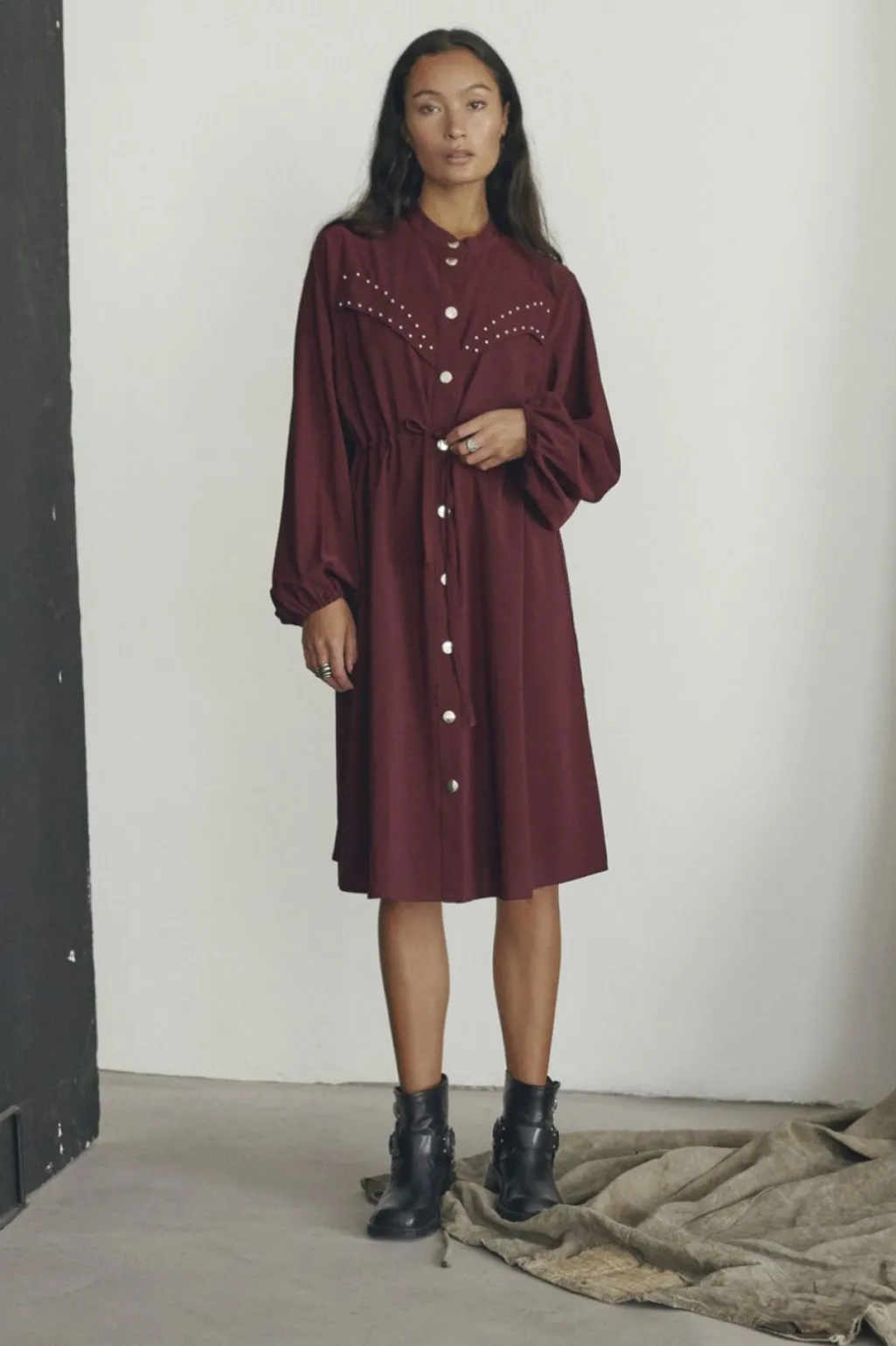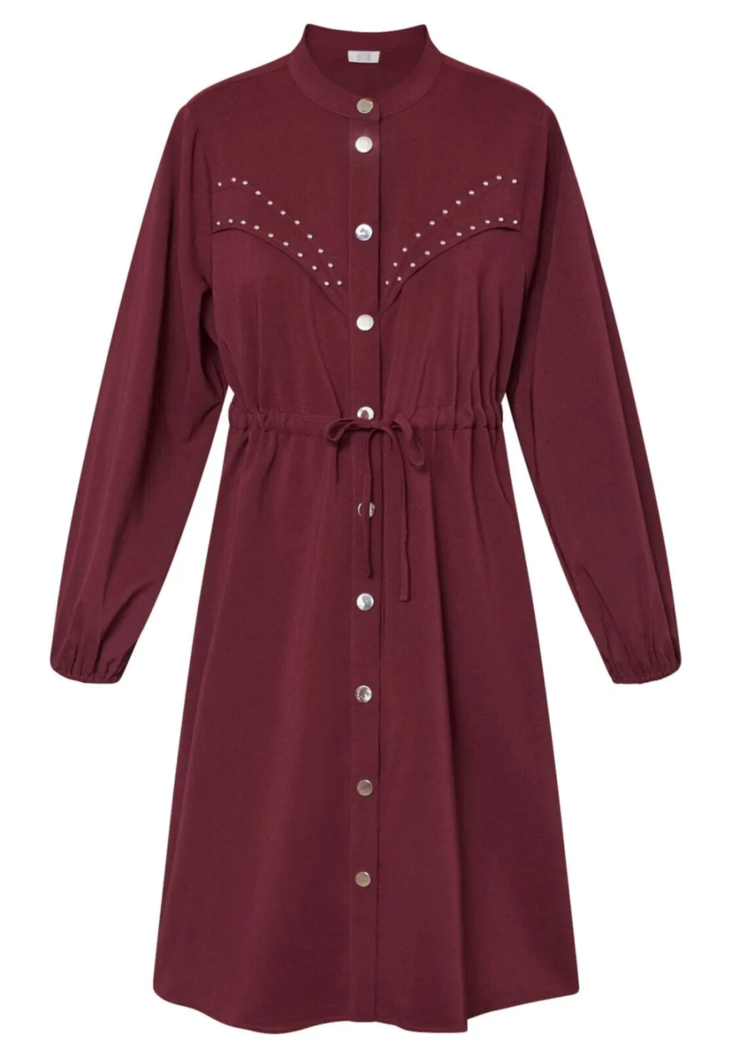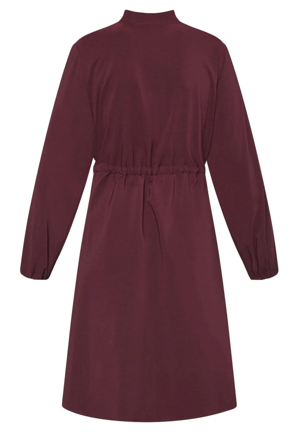 Kjole fra Love & Divine i dyb bordeauxfarve. Kjolen har høj hals, lange ærmer og knælængde med knaplukning foran.