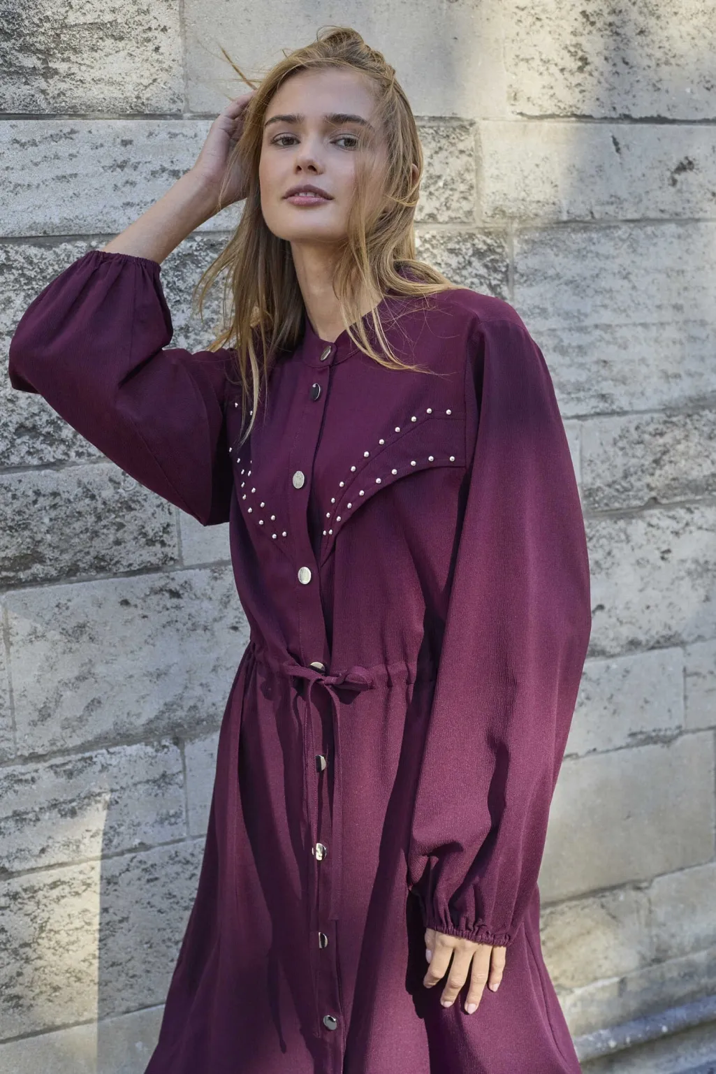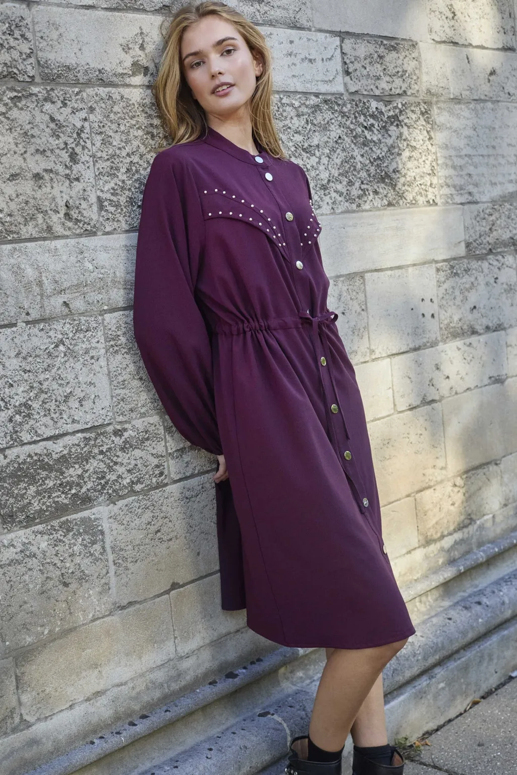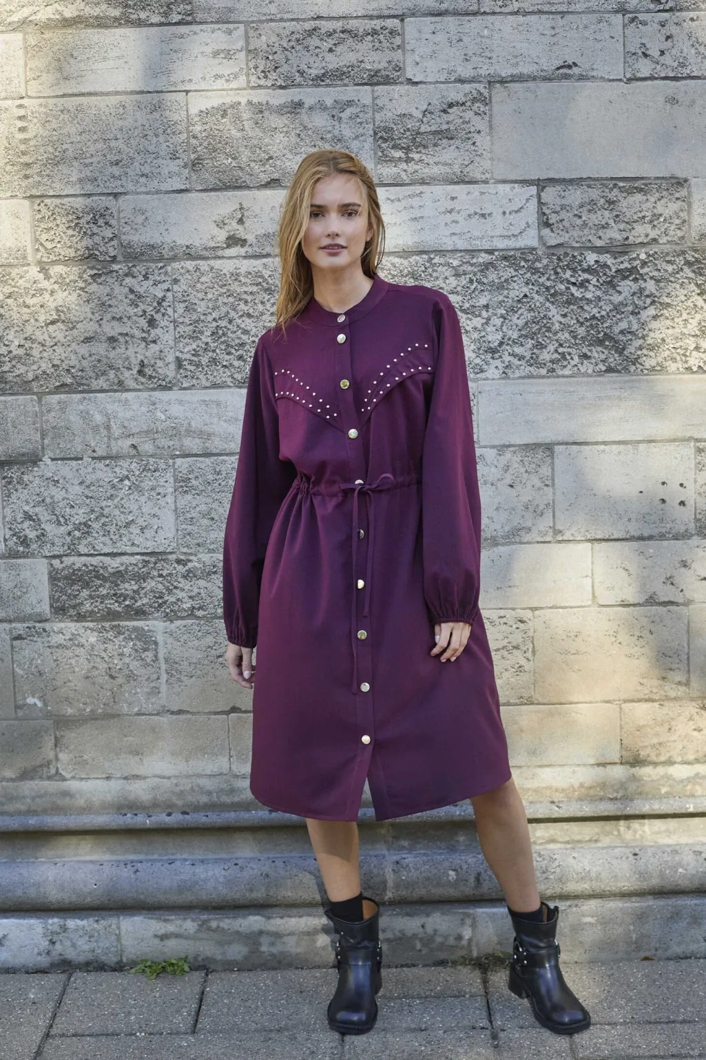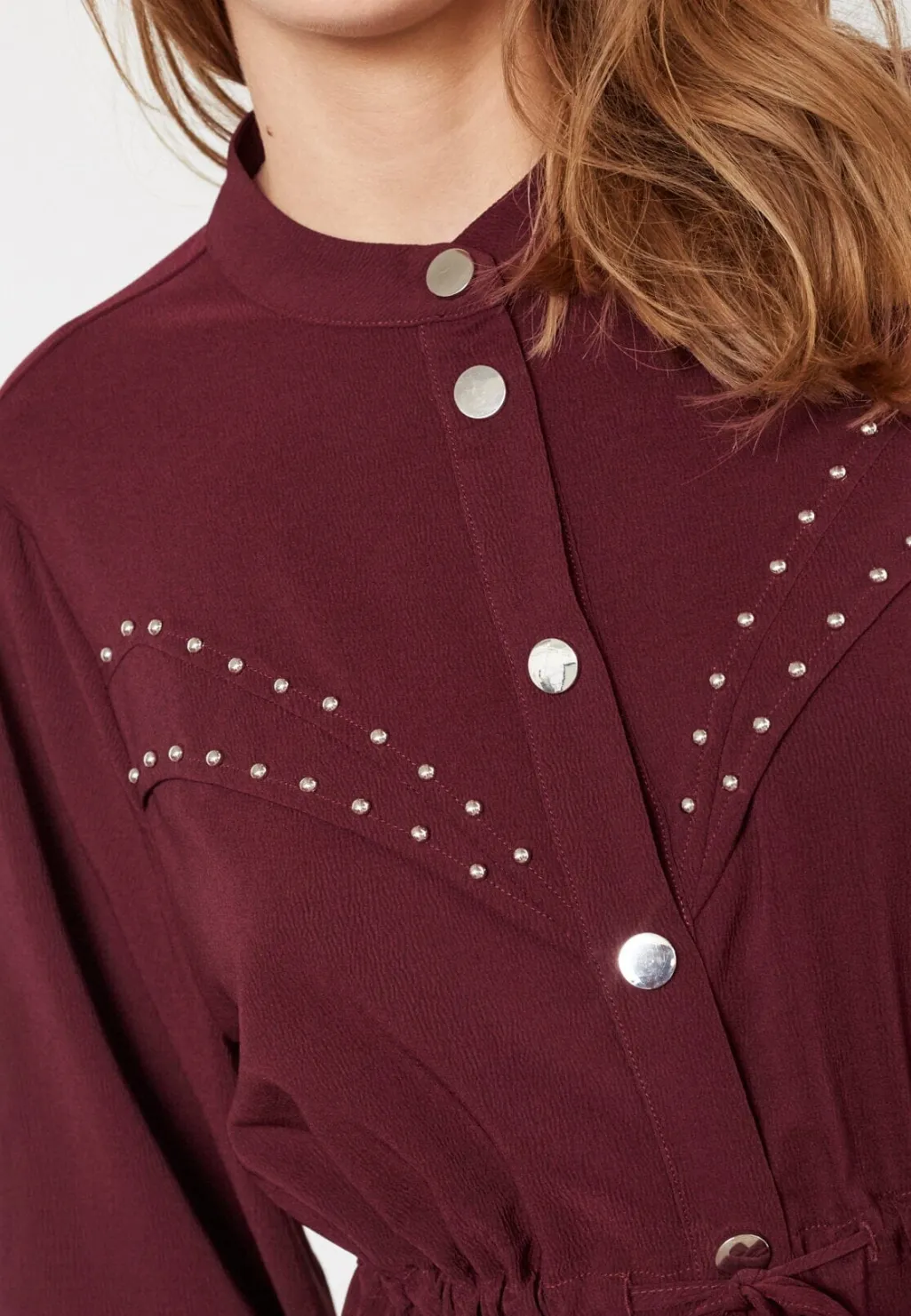 Kjole fra Love & Divine i dyb bordeauxfarve. Kjolen har høj hals, lange ærmer og knælængde med knaplukning foran.