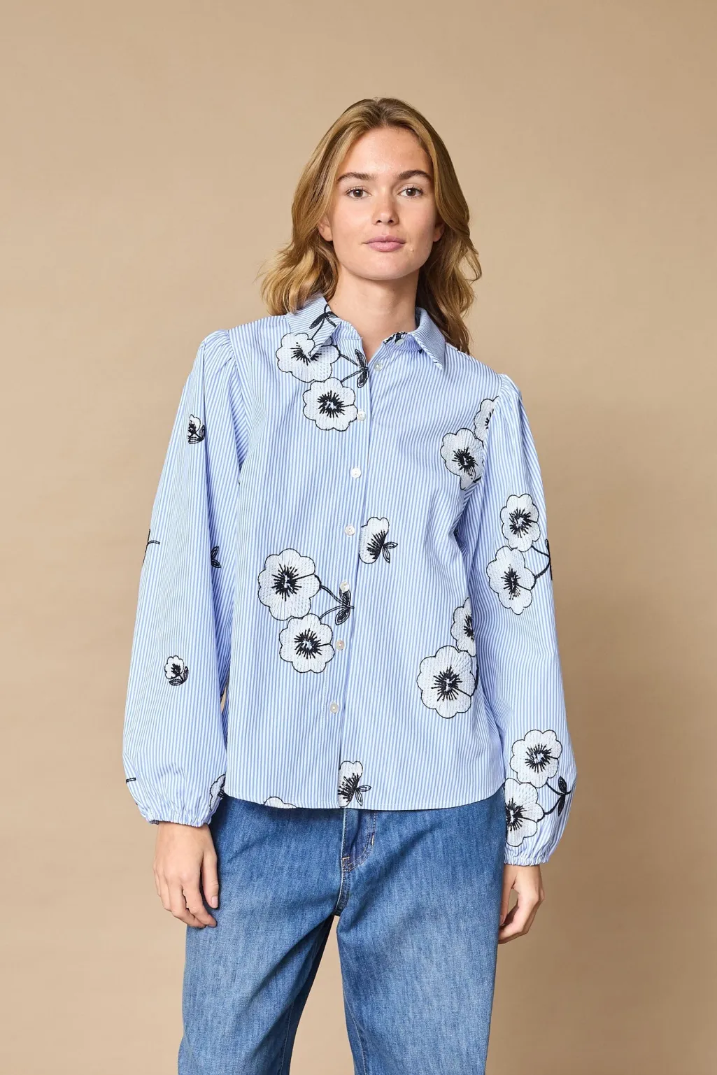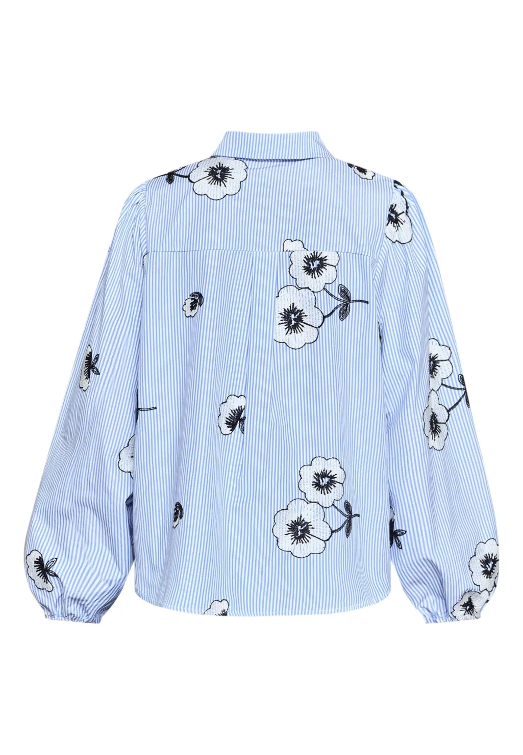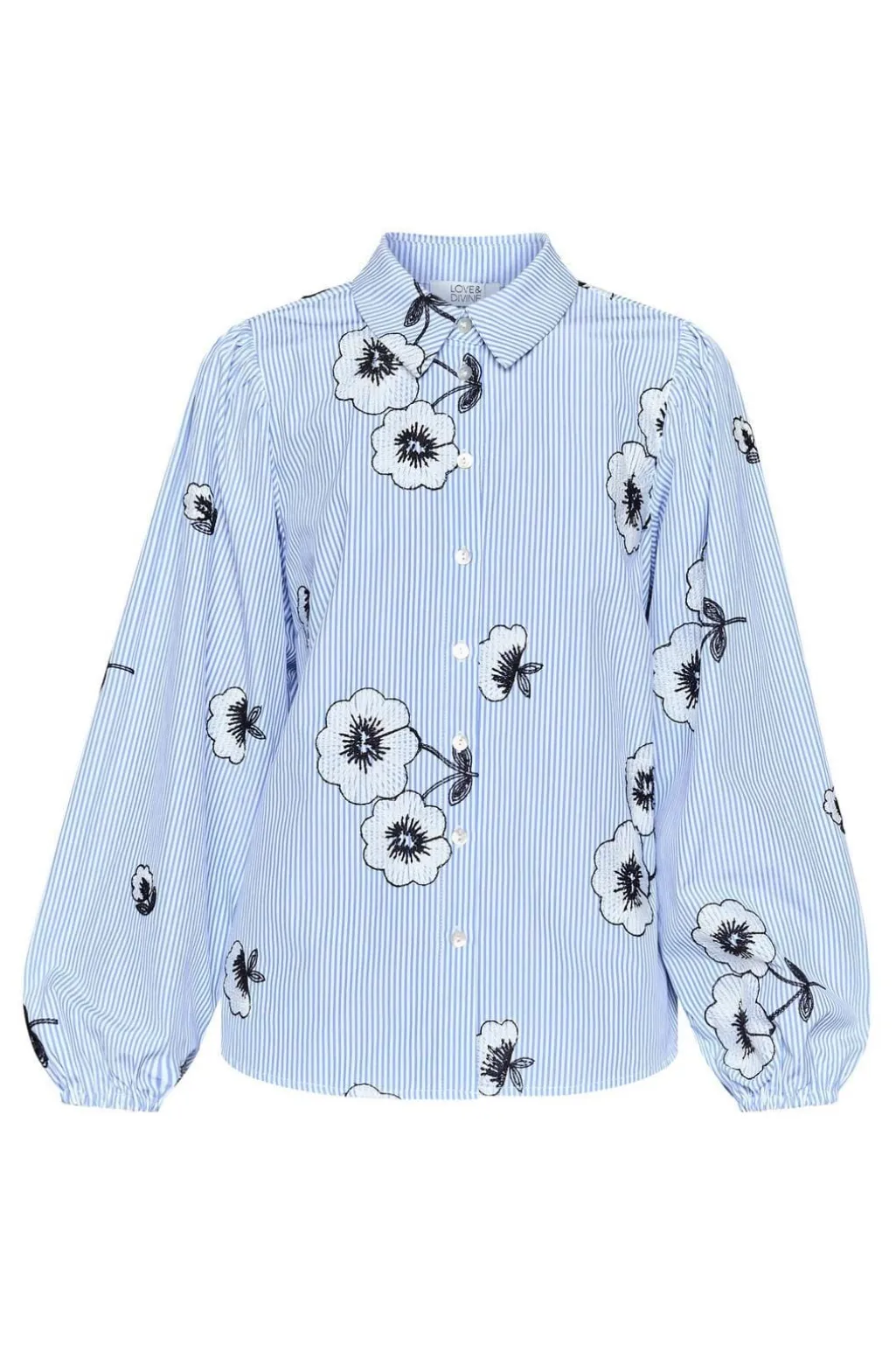Skjorte fra Love & Divine med broderede blomster på en stribet baggrund i lyseblå og hvid. Skjorten har lange ærmer og en løs pasform.
