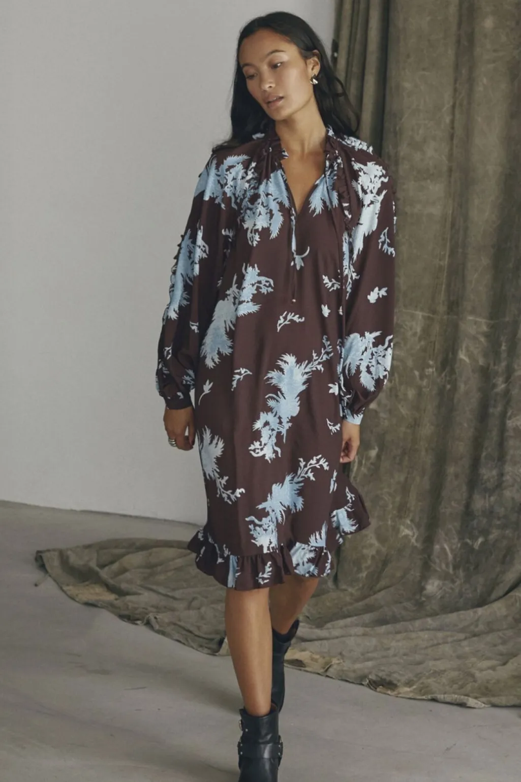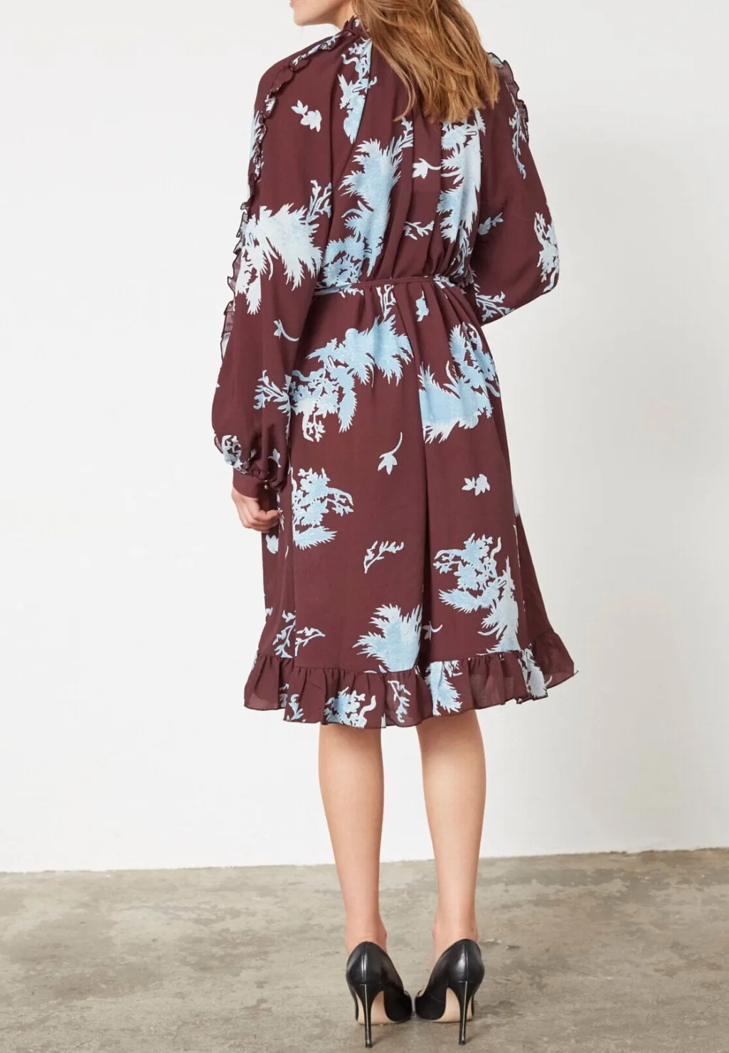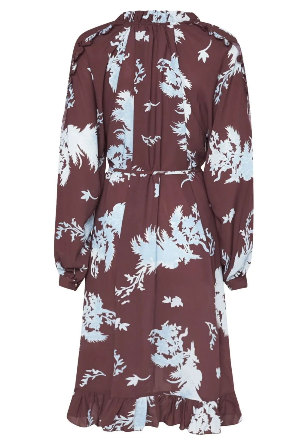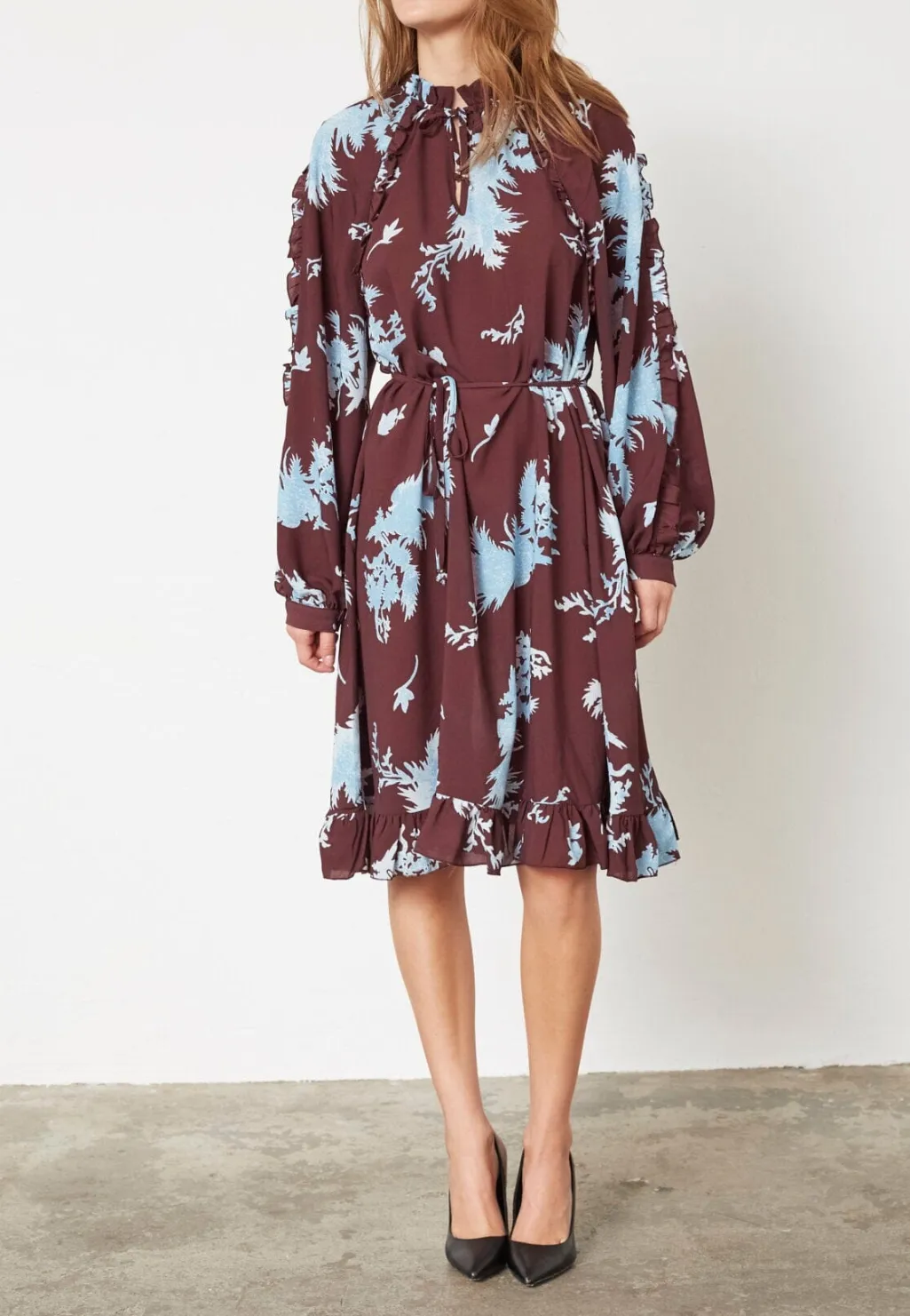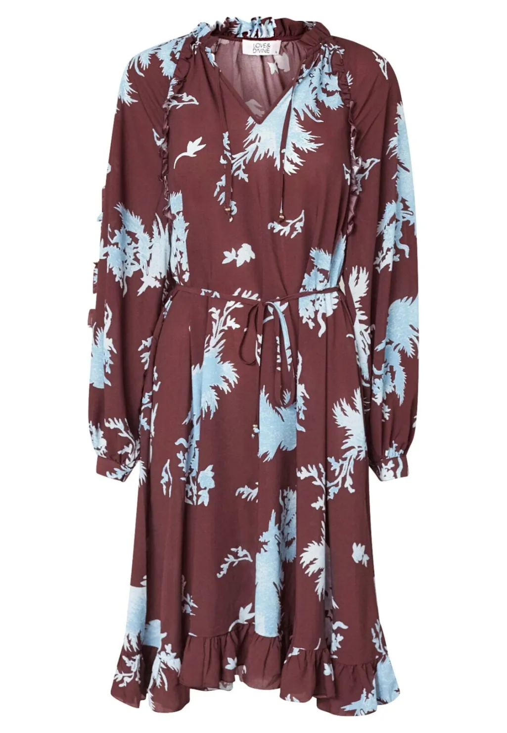 Knælang kjole fra Love & Divine med blomsterprint i bordeaux og lyseblå nuancer. Kjolen har lange ærmer og en løs pasform.
