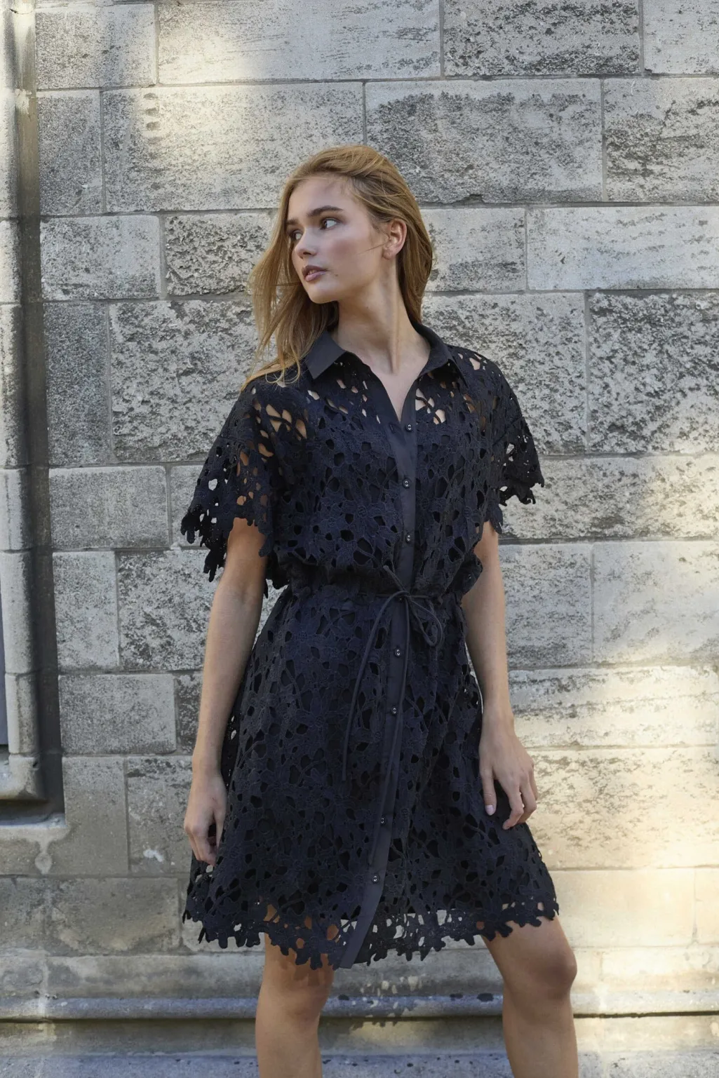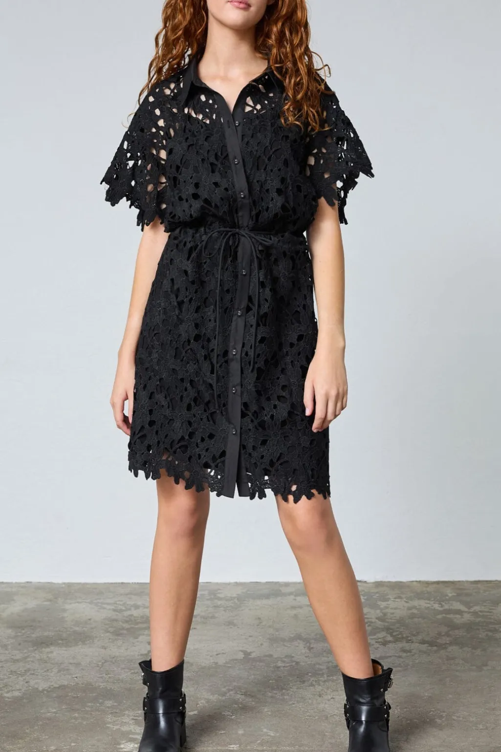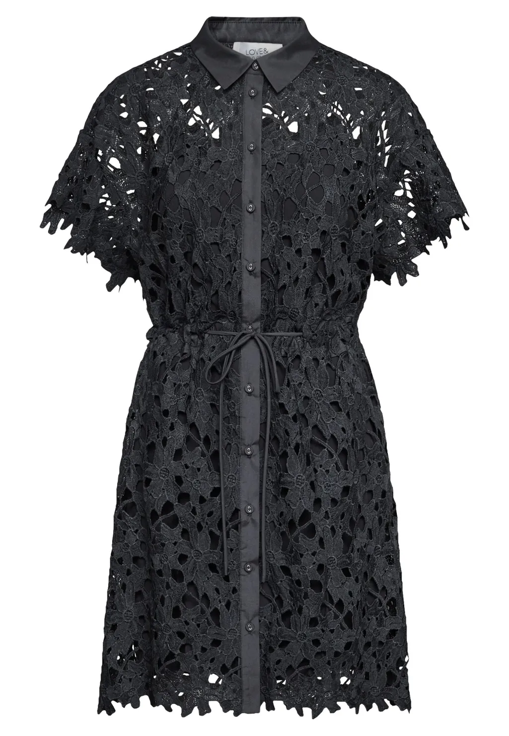 Sort kjole fra Love & Divine med et blomsteragtigt hulmønster i blonde. Kjolen har et gennemgående knaplukningsdesign og et bælte i taljen.