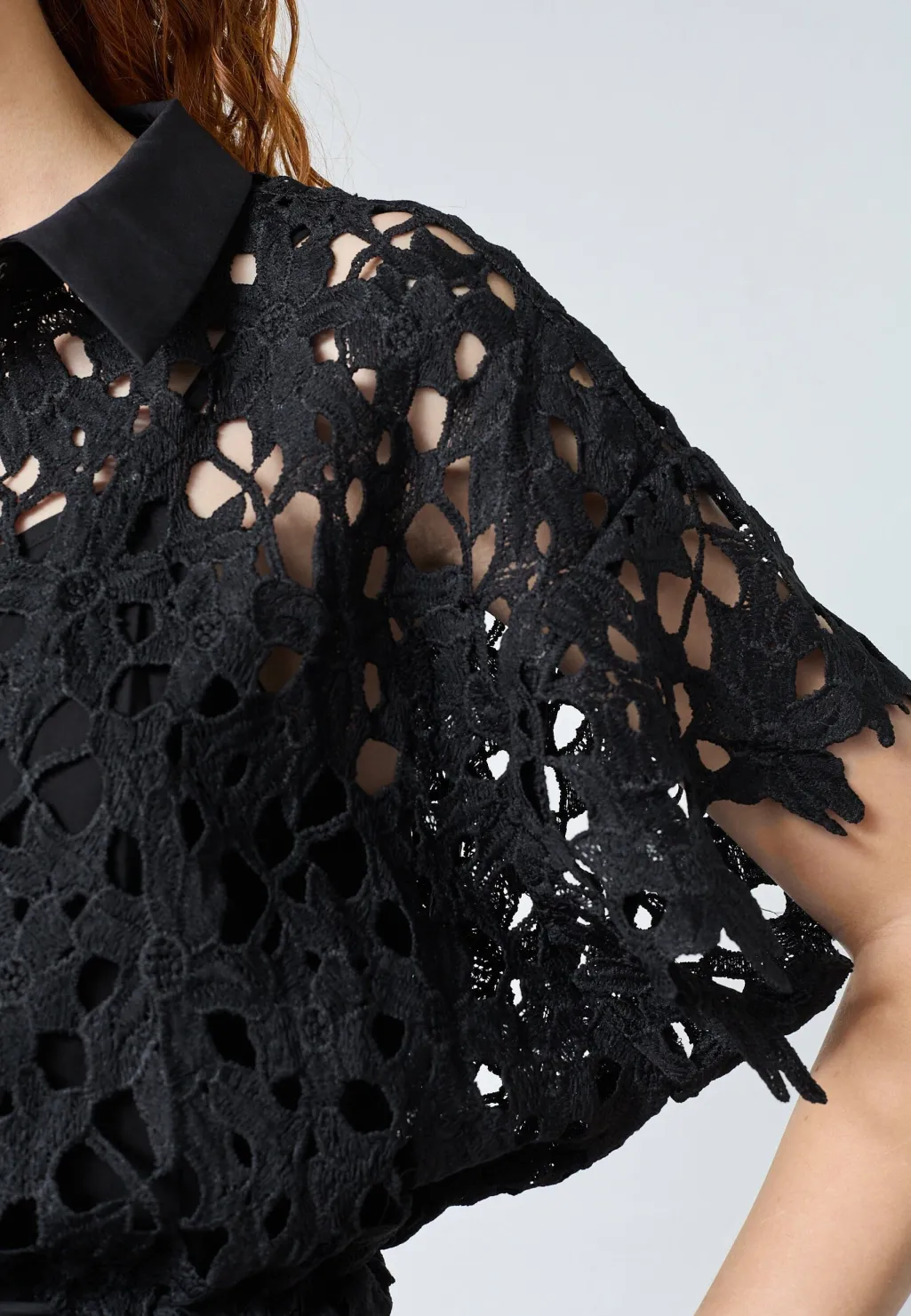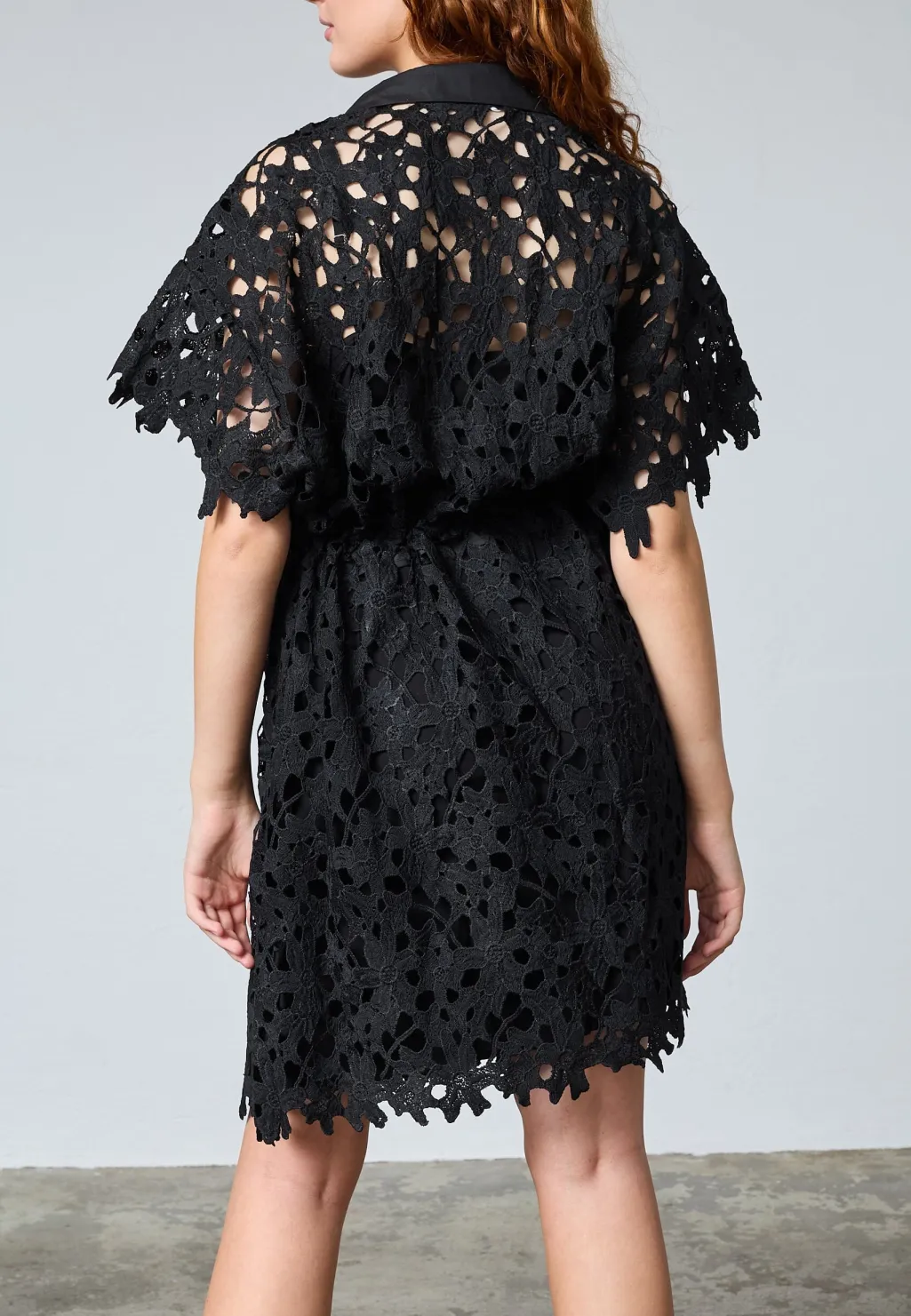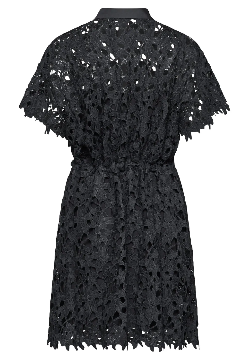 Sort kjole fra Love & Divine med et blomsteragtigt hulmønster i blonde. Kjolen har et gennemgående knaplukningsdesign og et bælte i taljen.