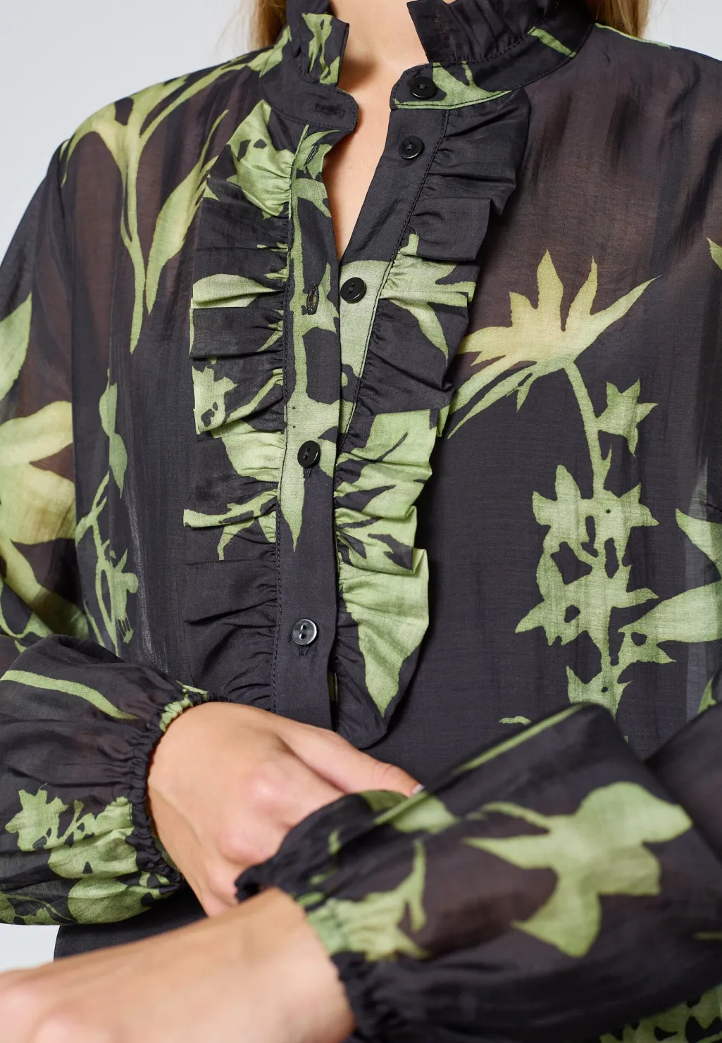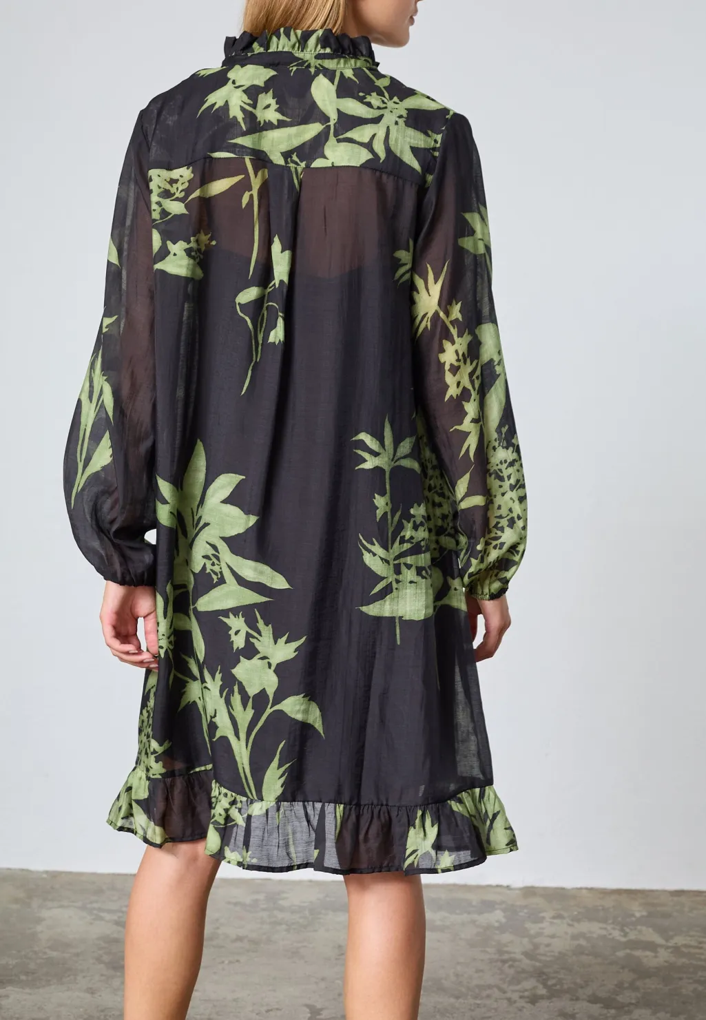 Knælang kjole fra Love & Divine med grønt bladmønster på mørk baggrund. Kjolen har en lille stående krave med flæser og lukkes med knapper.