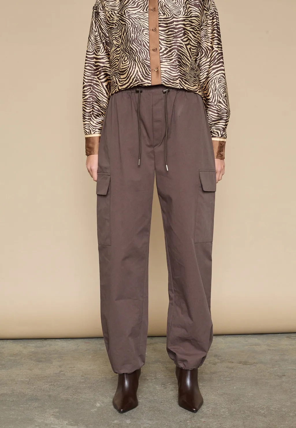 Brune bukser fra Love & Divine, lavet af 100 % bomuld. Bukserne har en høj talje, løs pasform og går ned til anklerne.