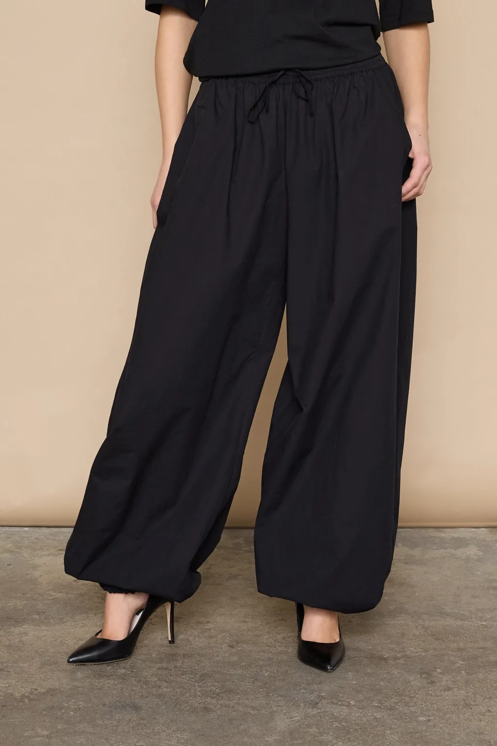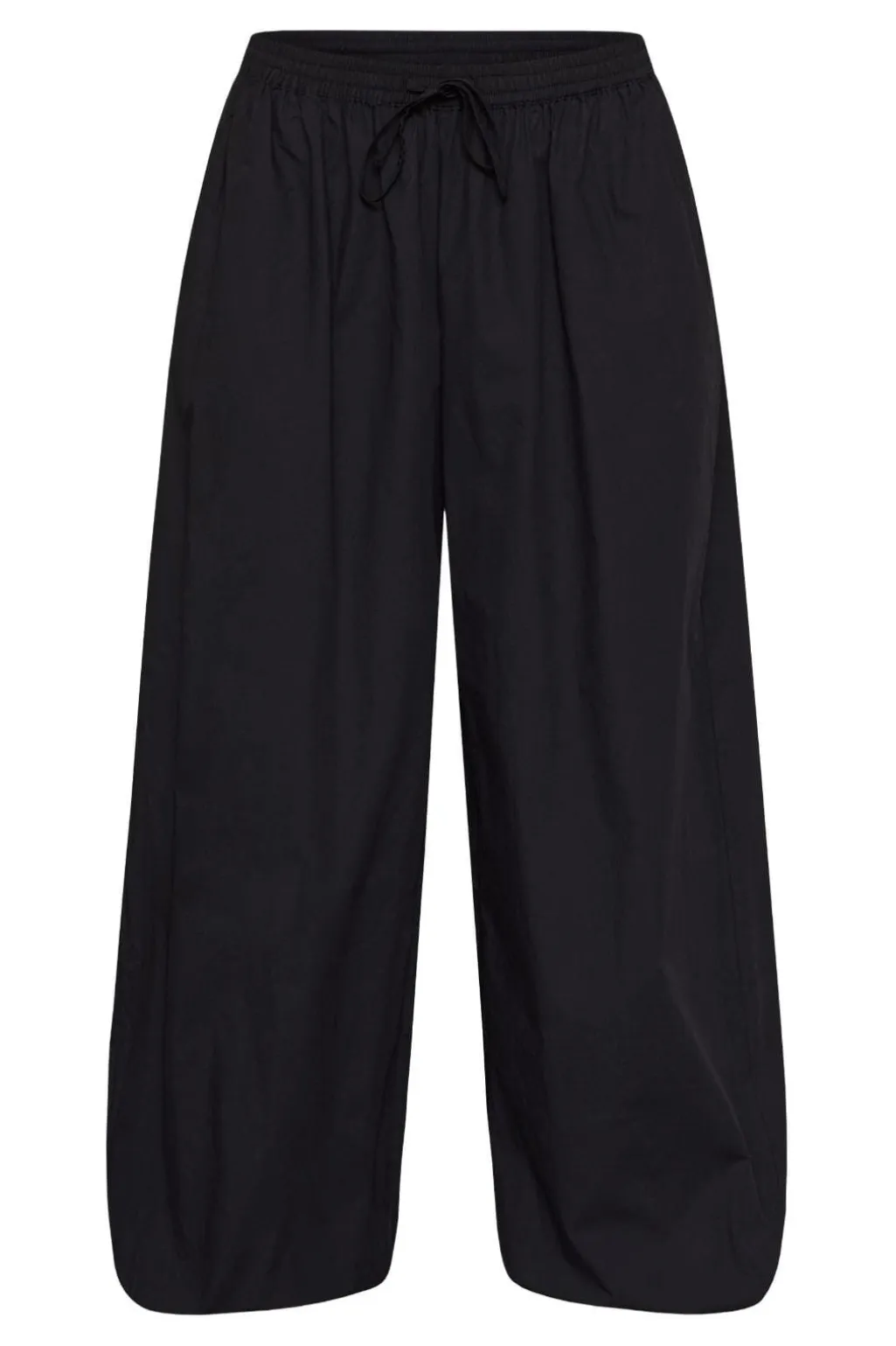 Sorte bukser fra Love & Divine, lavet af bomuld. Bukserne har et løstsiddende snit med brede ben og en elastisk talje med snor.