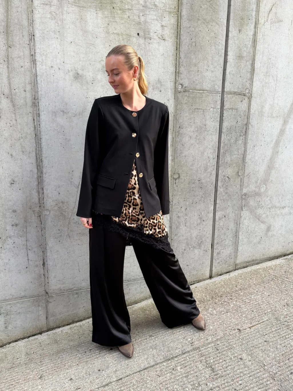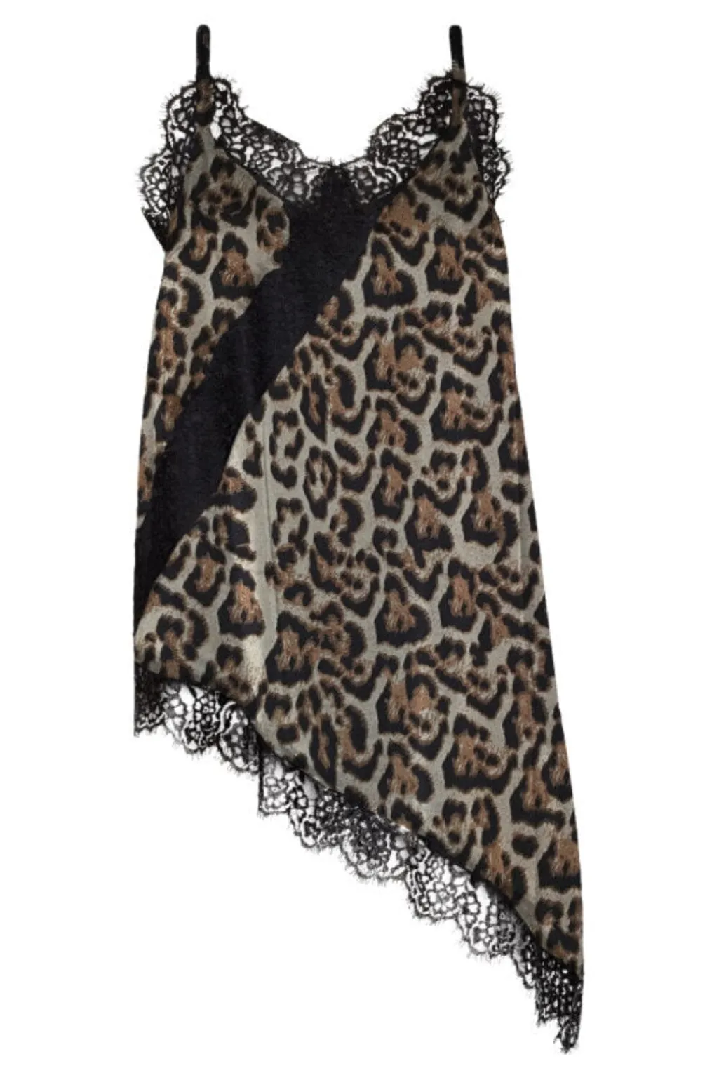 Top fra Love & Divine med leopardmønster i brune og beige nuancer på sort baggrund. Toppen har blondekanter og et asymmetrisk design med skrå kant.