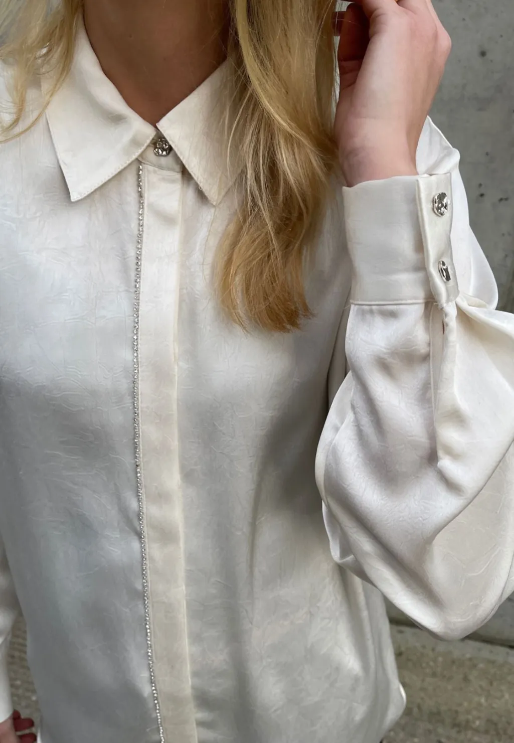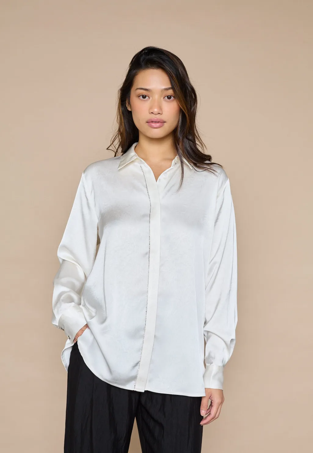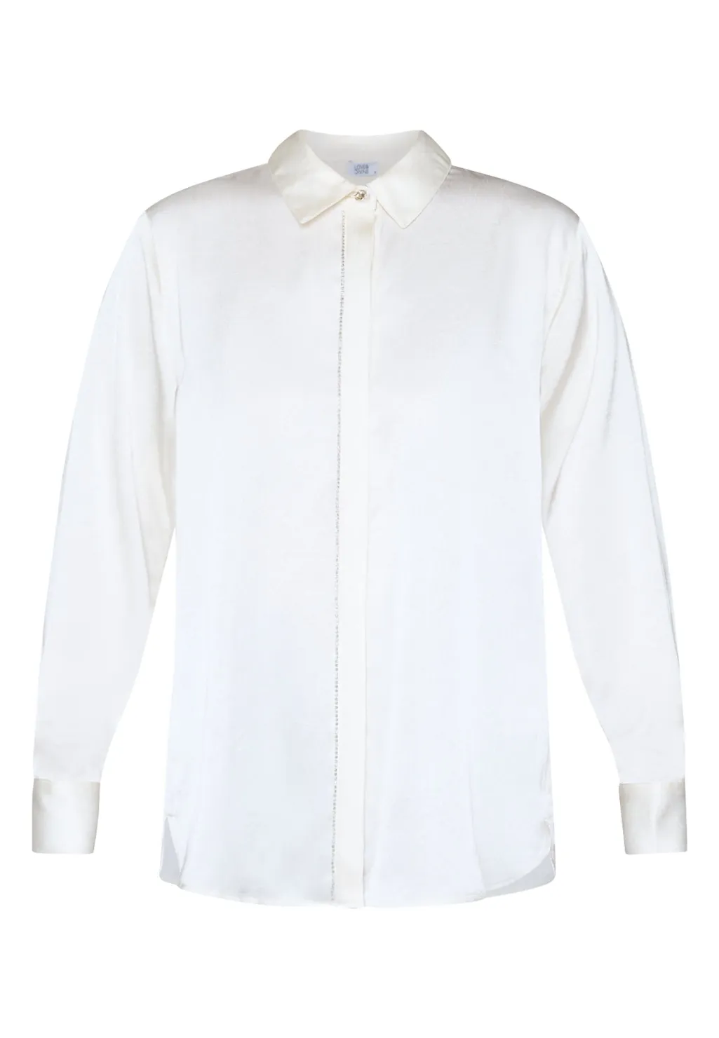 Cremefarvet skjorte fra Love & Divine med klassisk krave og lange ærmer. Skjorten har pailletter langs knaplukningen og manchetter med knapper.