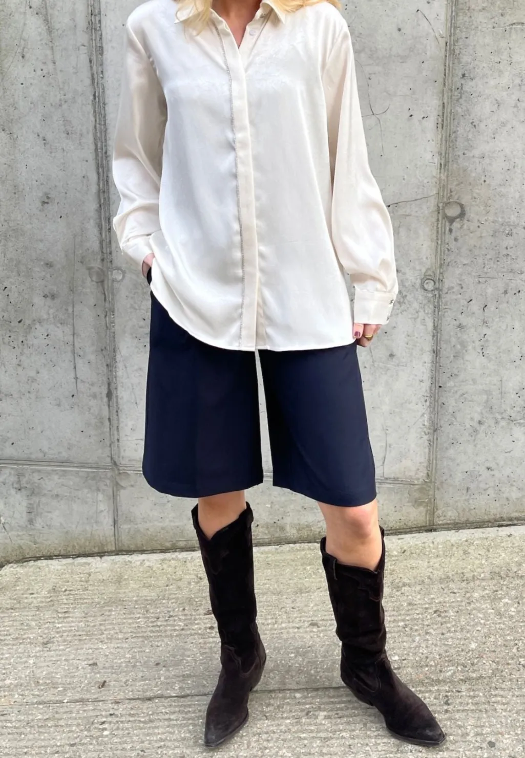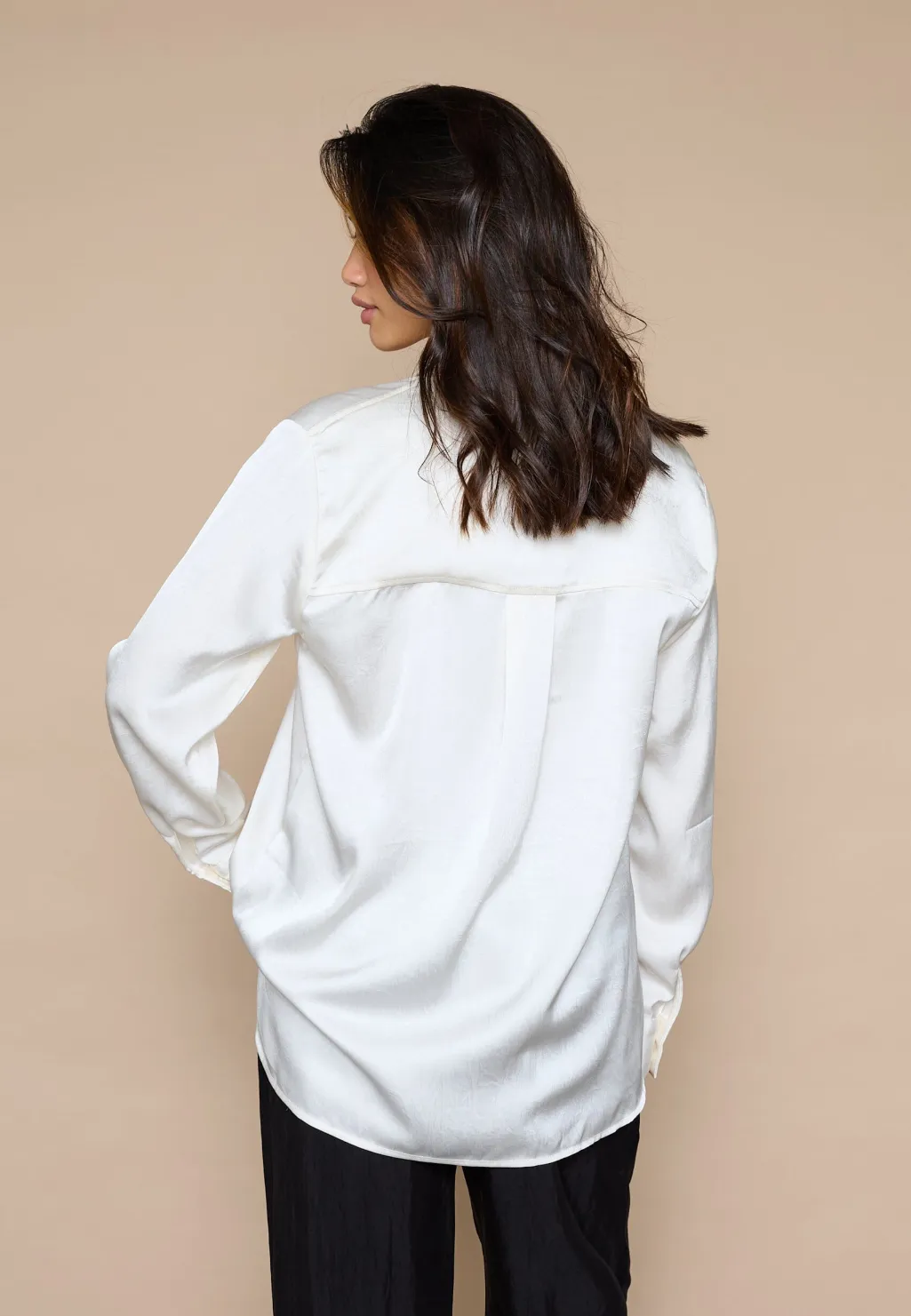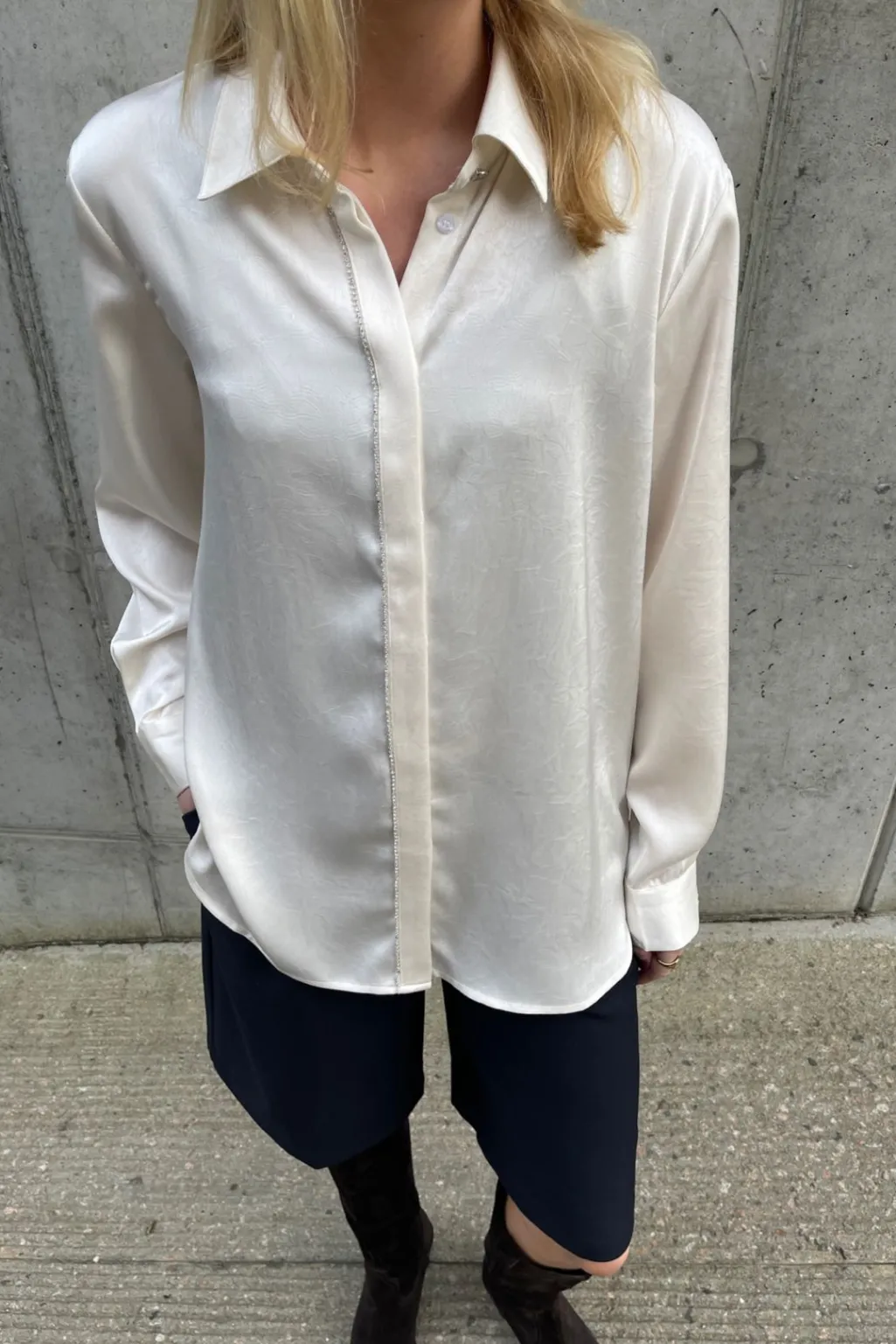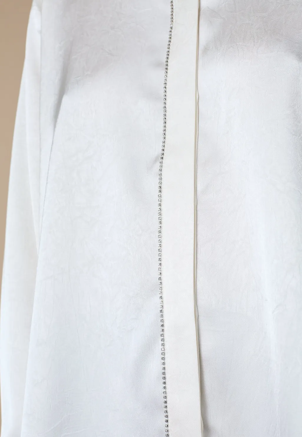 Cremefarvet skjorte fra Love & Divine med klassisk krave og lange ærmer. Skjorten har pailletter langs knaplukningen og manchetter med knapper.