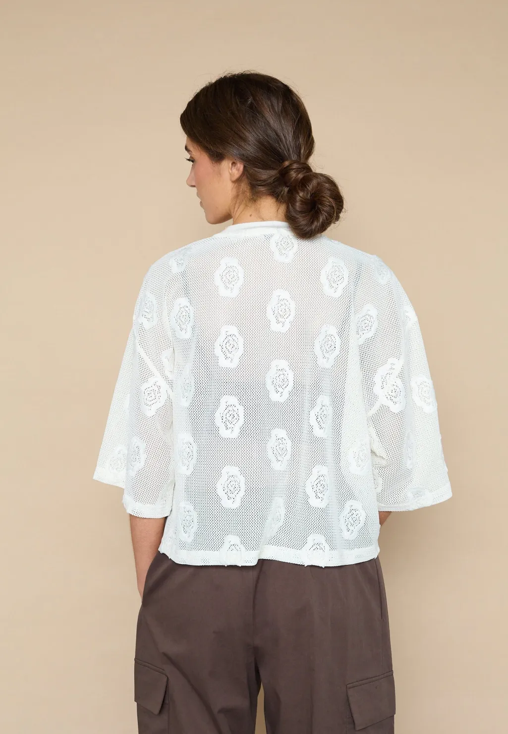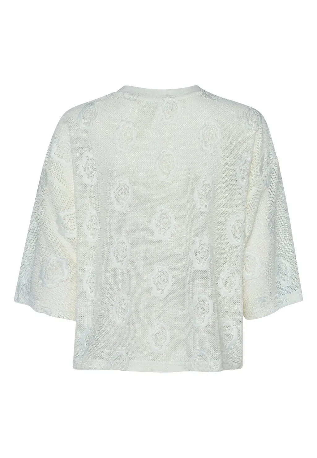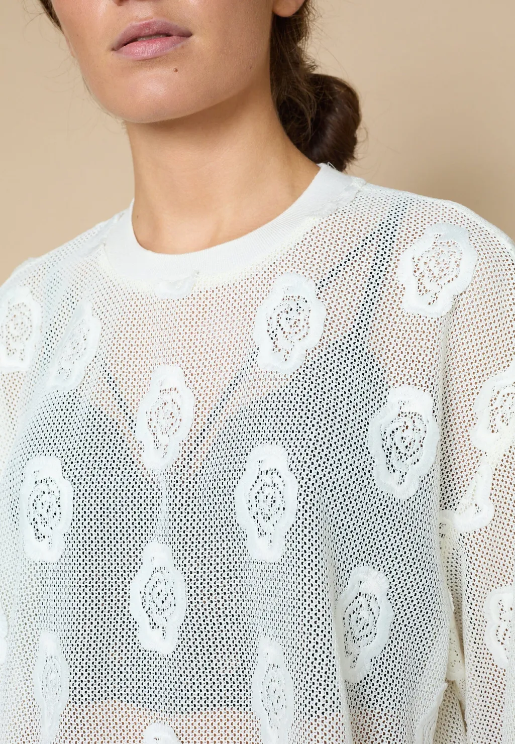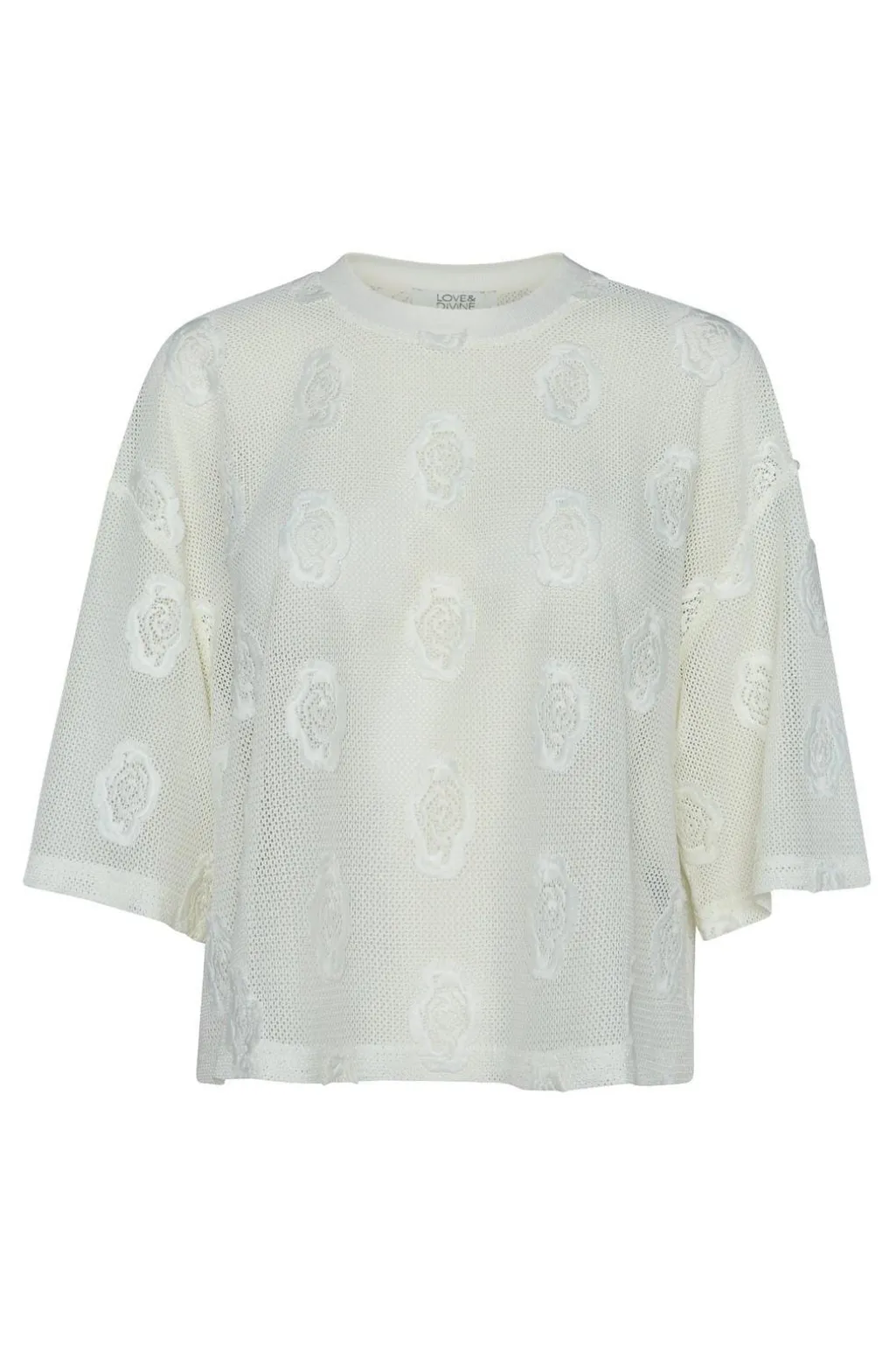 En cremefarvet meshbluse fra Love & Divine med broderede blomsterdetaljer. Blusen har et netmønster med en let gennemsigtig effekt.