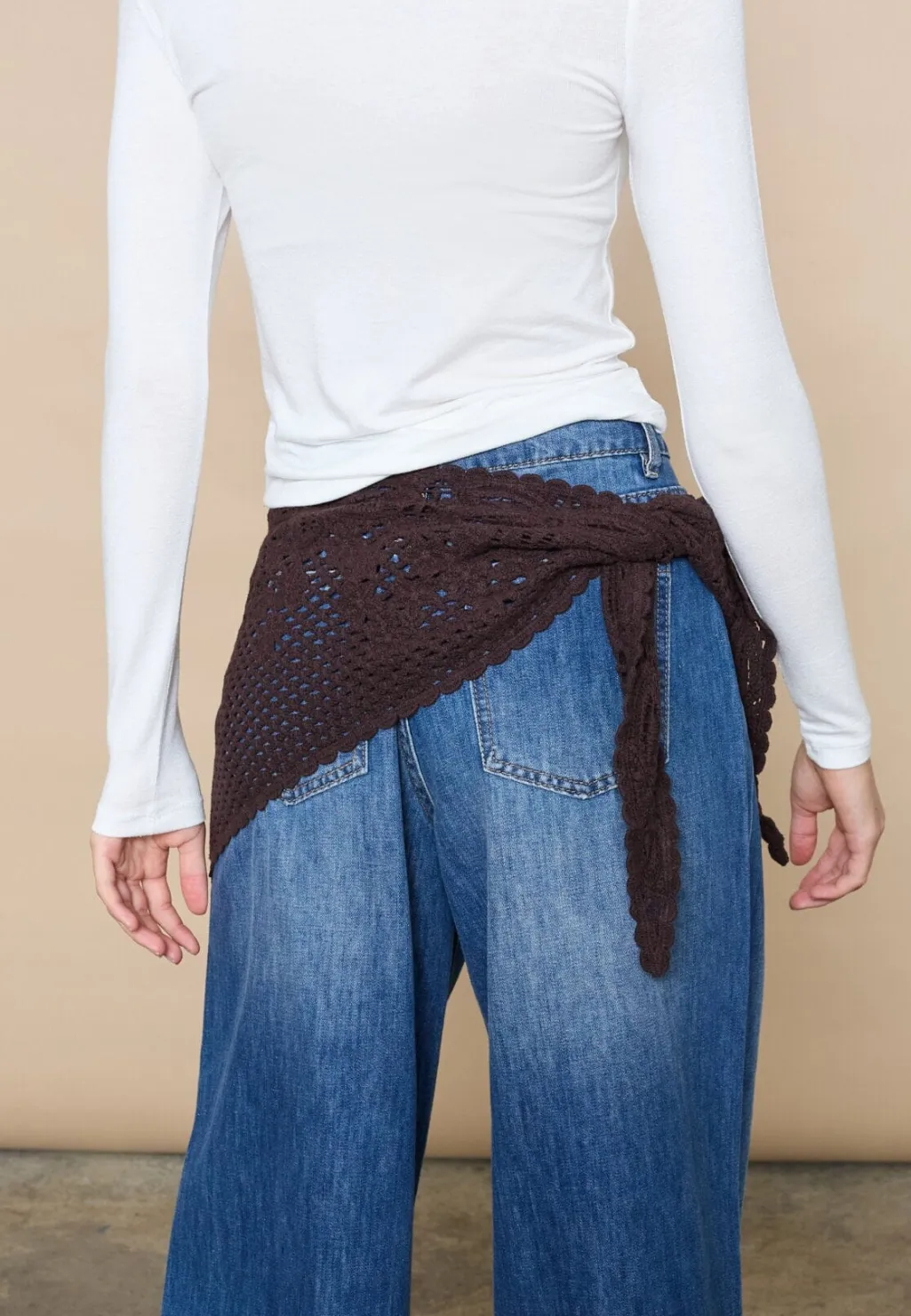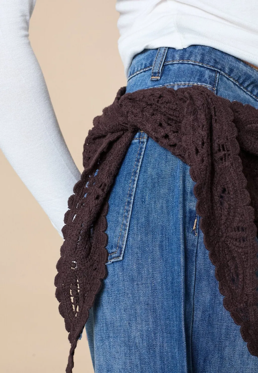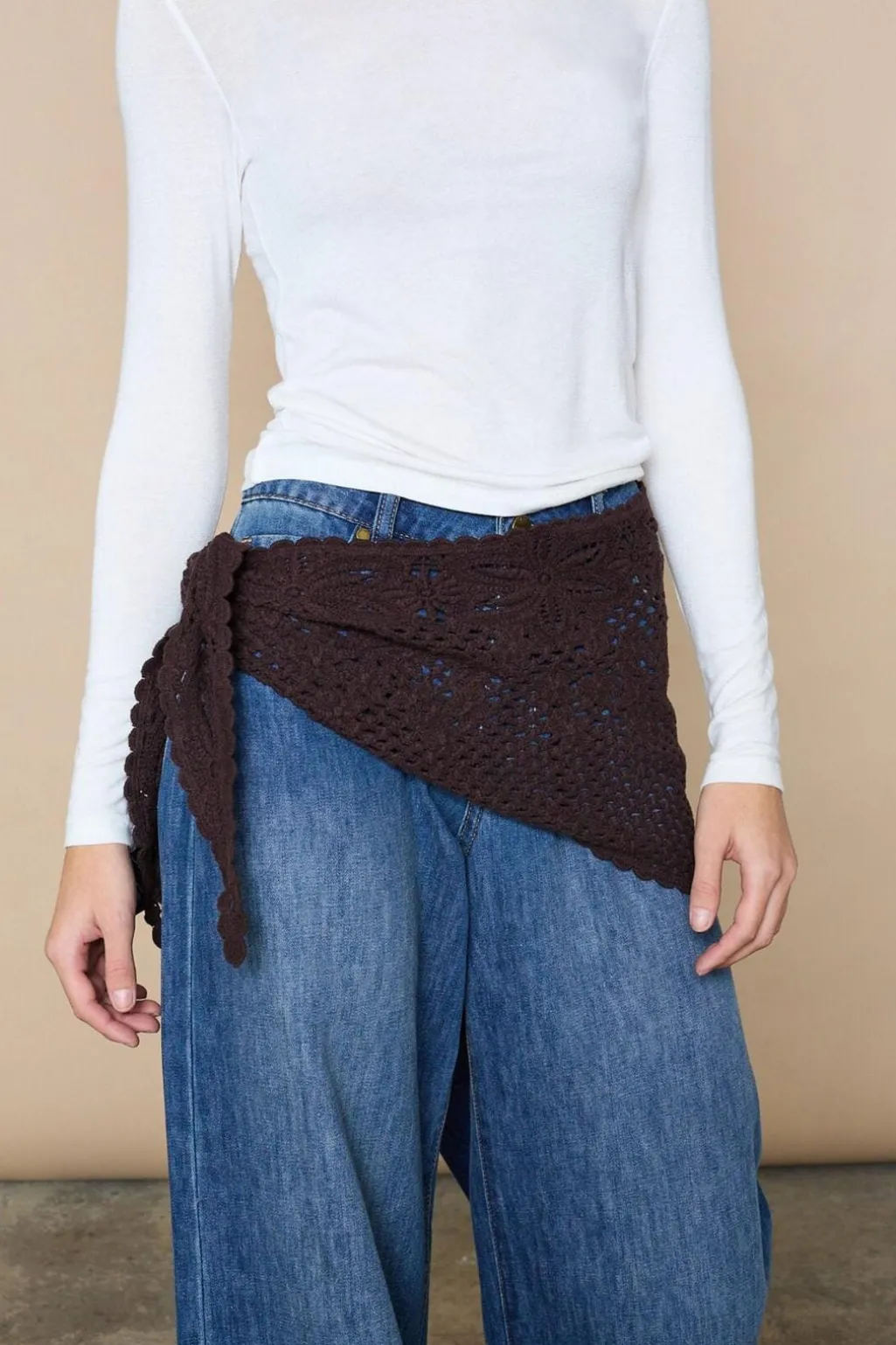 Hæklet tørklæde fra Love & Divine i mørkebrun. Tørklædet har et blomsterlignende hæklet mønster og kan bæres på flere måder.