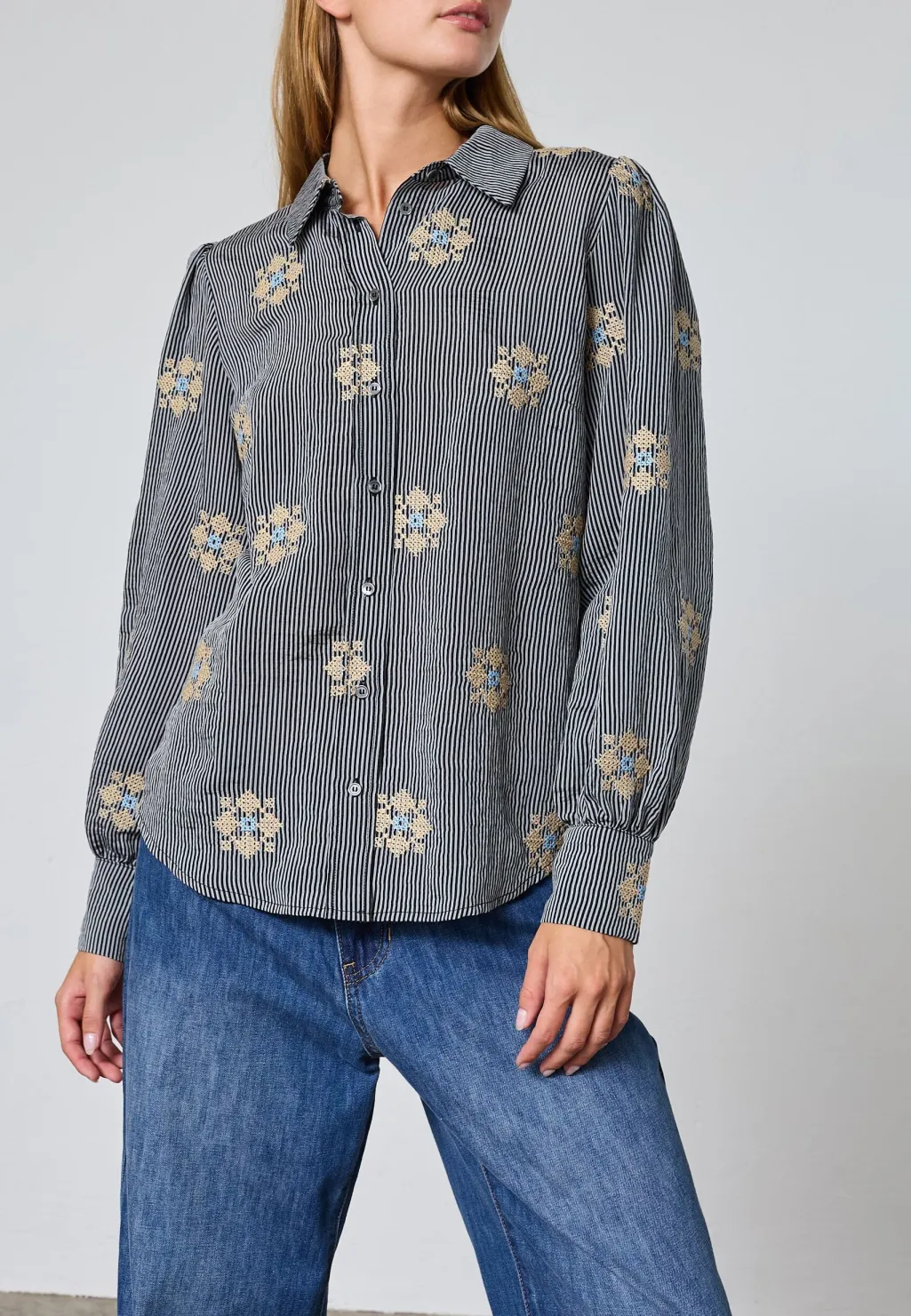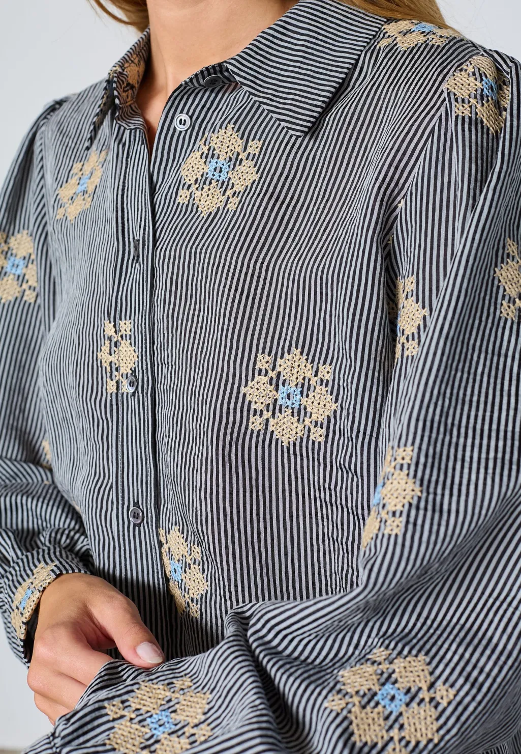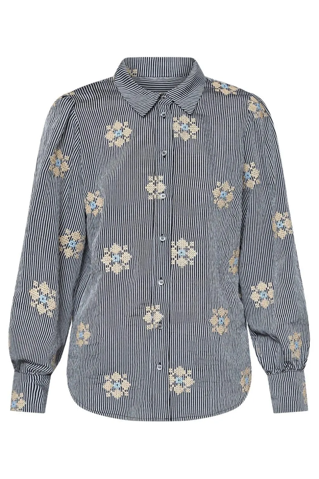 Stribet skjorte fra Love & Divine med sorte og hvide striber. Skjorten har broderede blomsterdetaljer, der skaber kontrast til det stribede mønster.