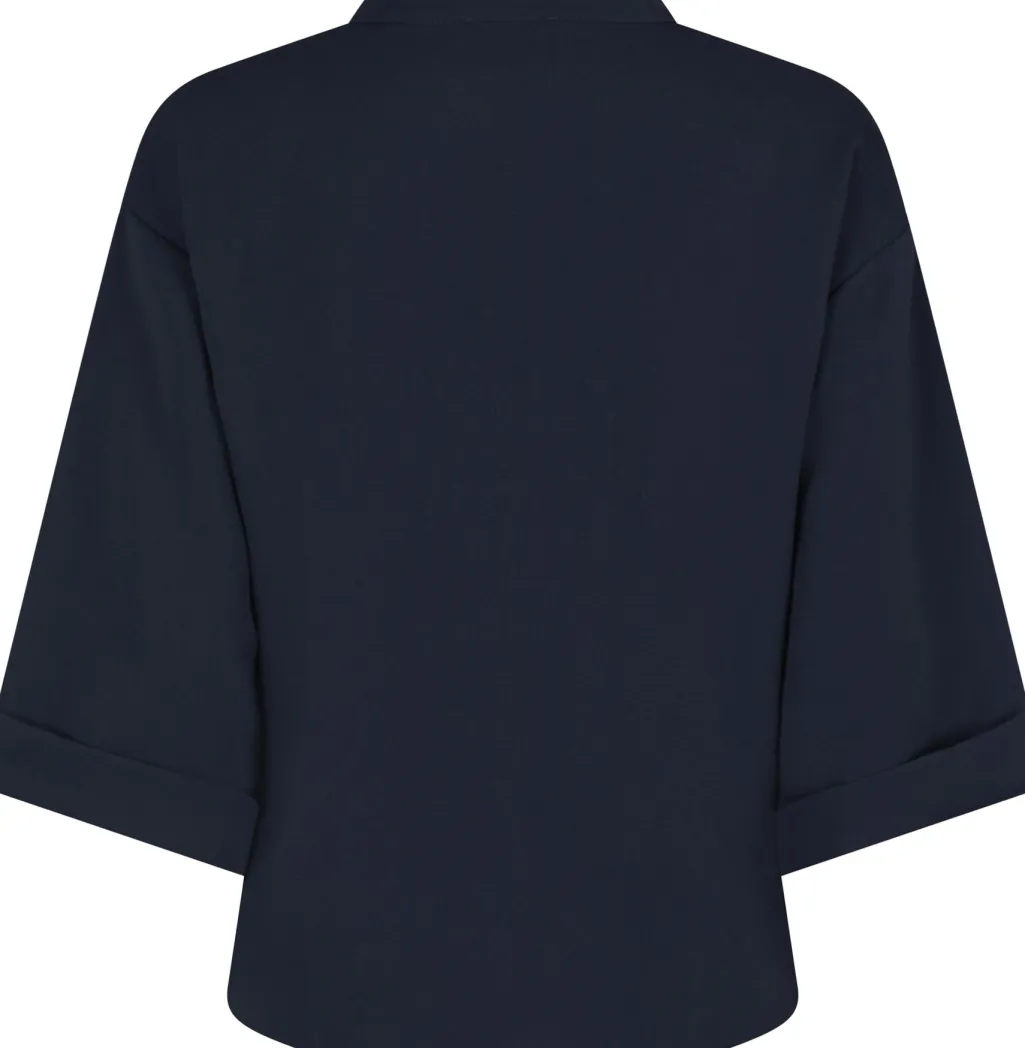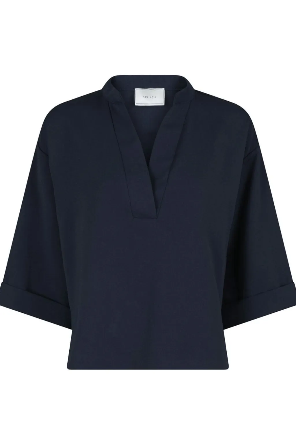 Mørkeblå bluse fra Neo Noir i blød crepe. Den har en løs pasform med boxy snit, v-hals og 3/4 ærmer med opsmøg.