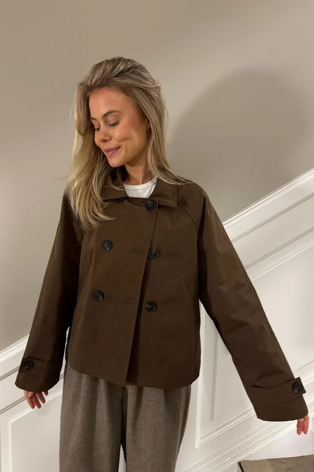 Mørkebrun trenchcoat med cropped længde og løs pasform. Den har store sorte knapper i et dobbeltknapdesign og en klassisk skjortekrave.