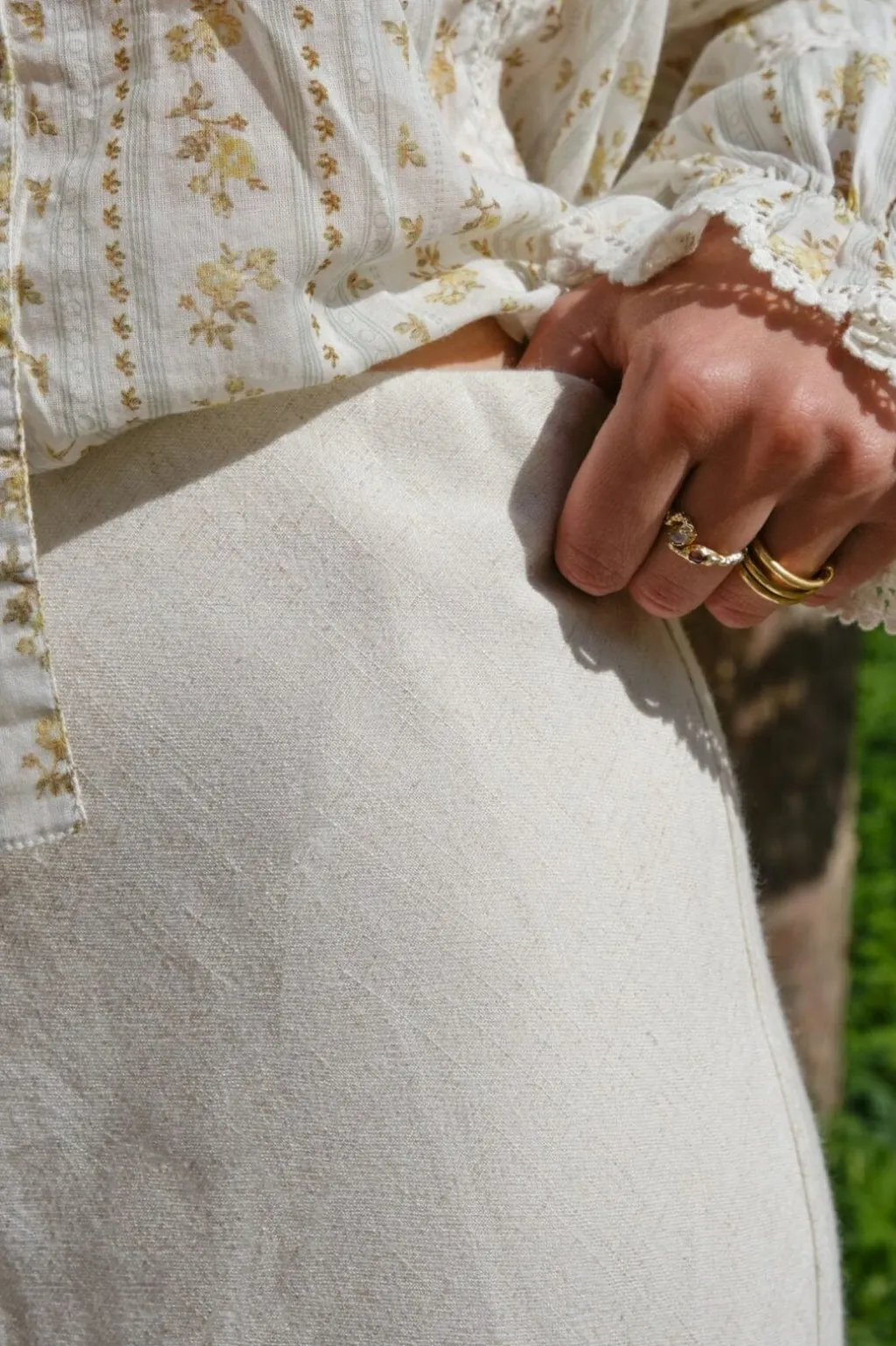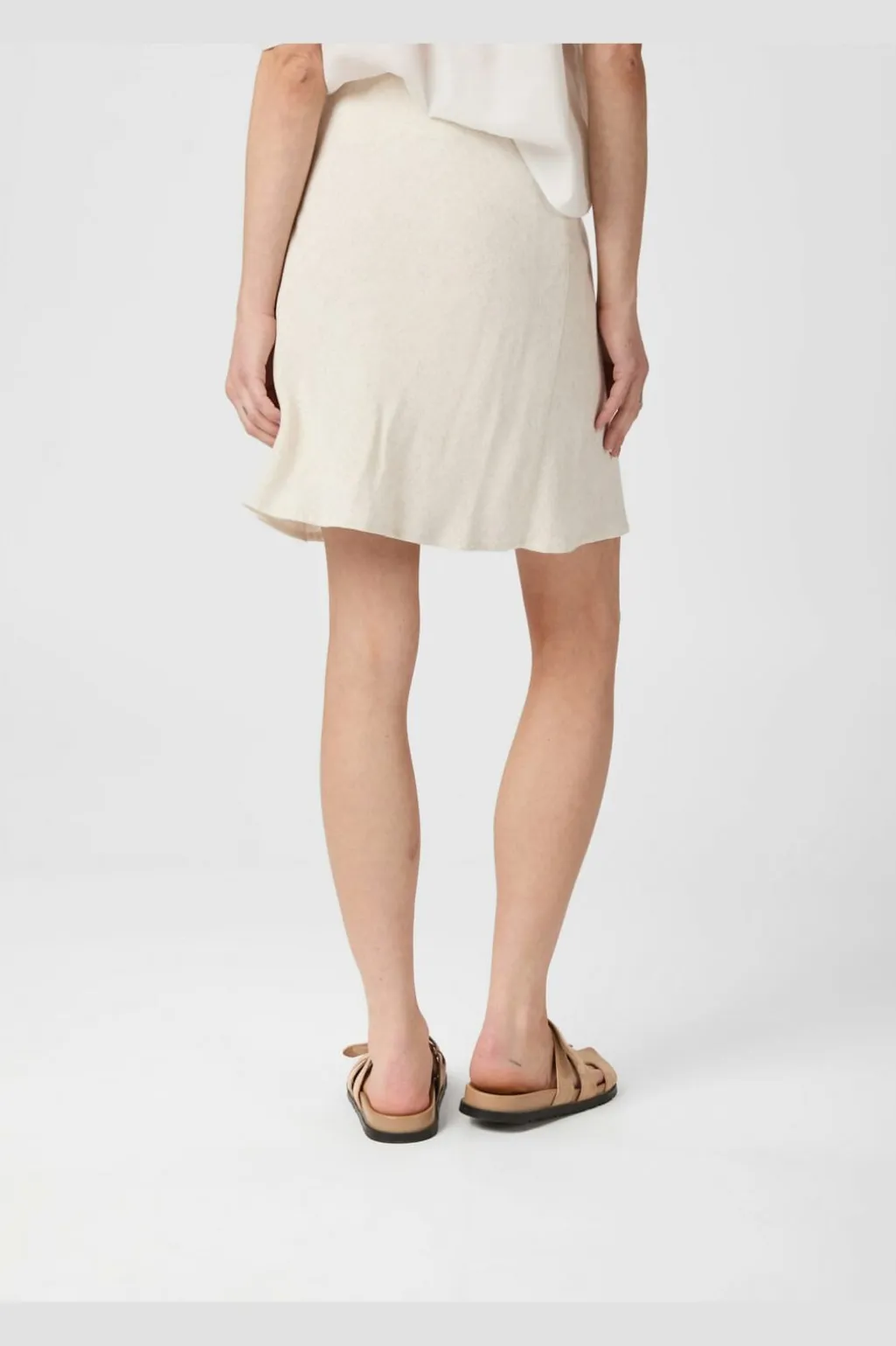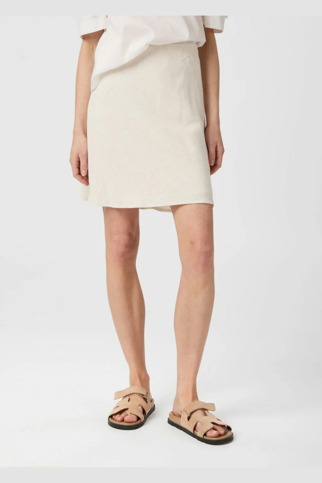 Kort nederdel fra Neo Noir i naturfarvet hørblanding. A-formet snit med løs pasform og rund kant forneden.
