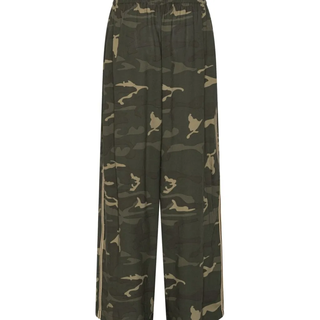 Brede bukser fra Continue, lavet af 100 % viskose med et camouflage-mønster i grønne nuancer. Bukserne har en elastisk linning med snor.