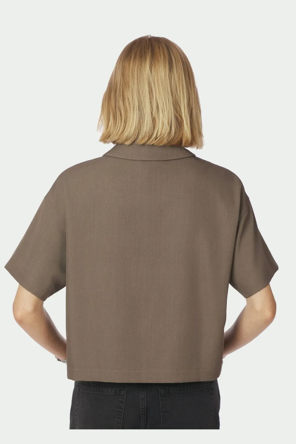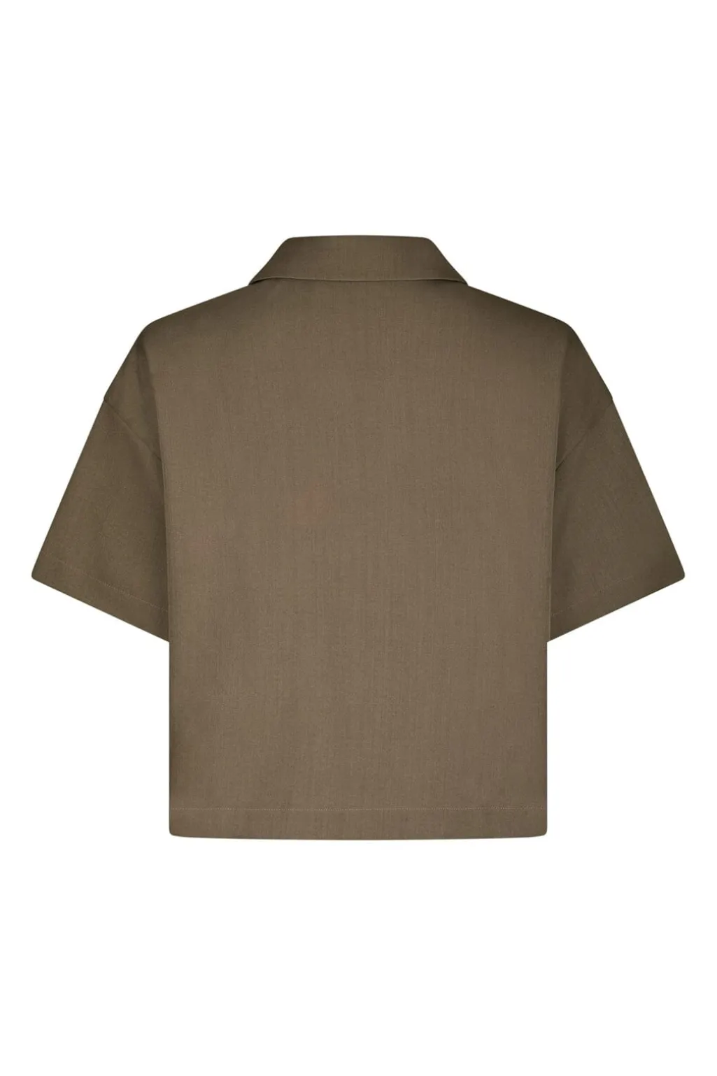 Bluse fra Neo Noir i taupe med skjortekrave og løs pasform. Den er fremstillet i et struktureret stof med dekorative syninger og har en praktisk lynlås foran.