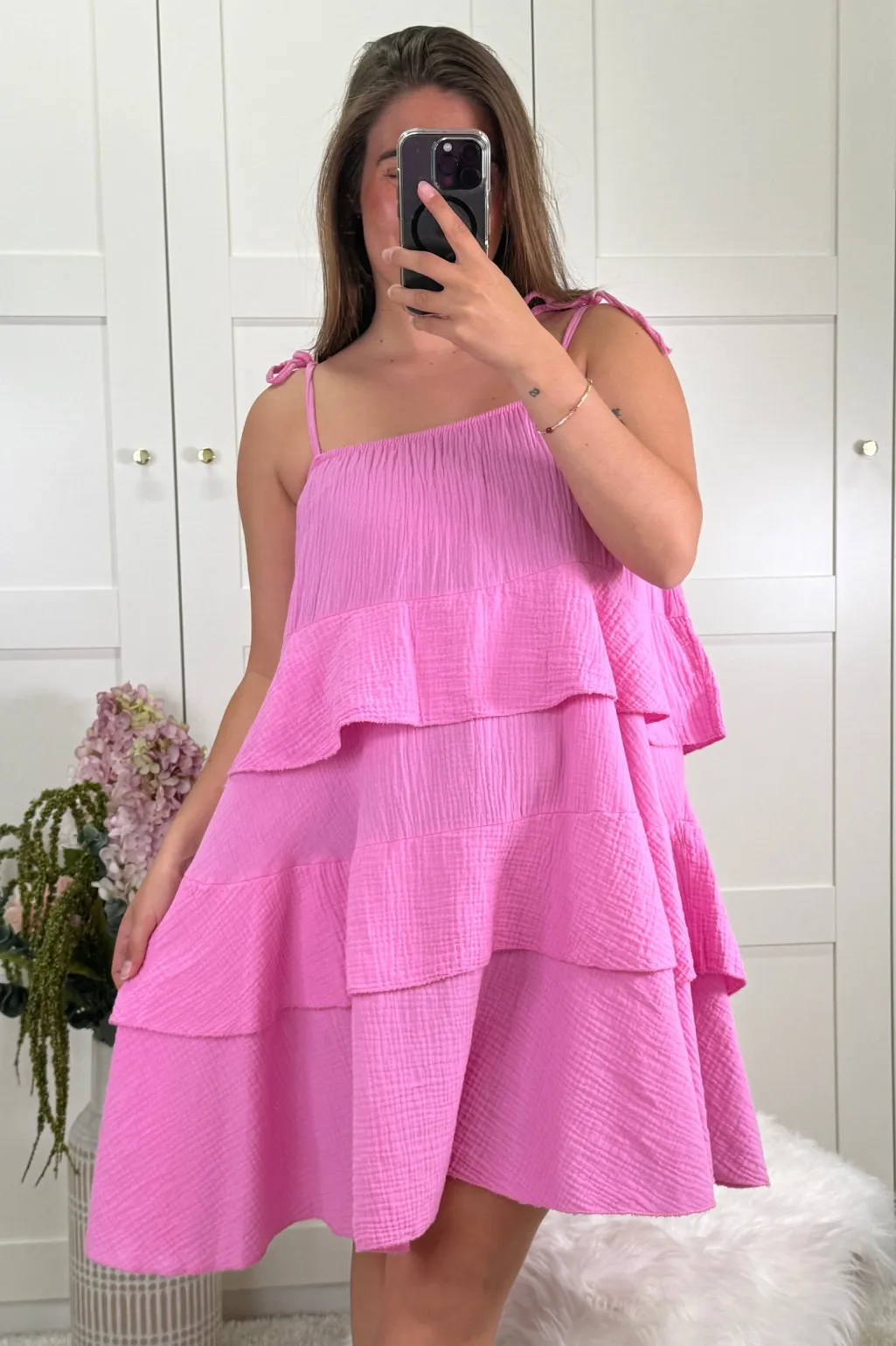 Pink kjole fra A-bee med lagdelt design. Kjolen har tre flæser og en firkantet udskæring. Stropperne kan justeres med sløjfer på skuldrene.