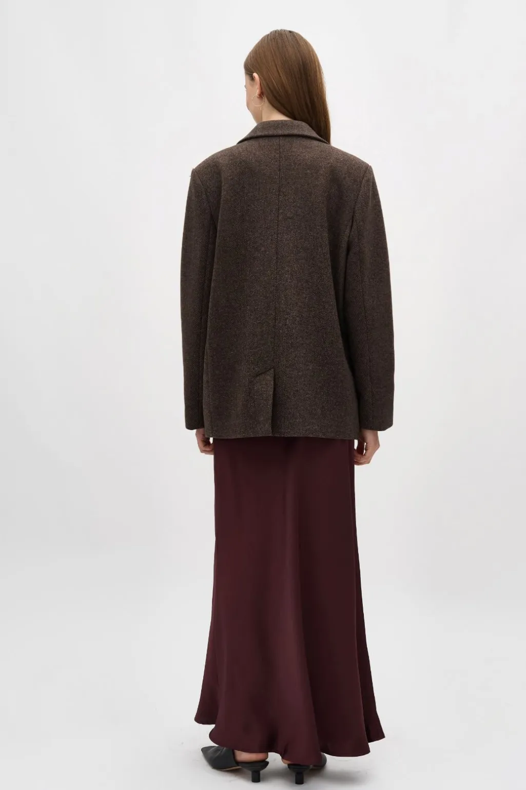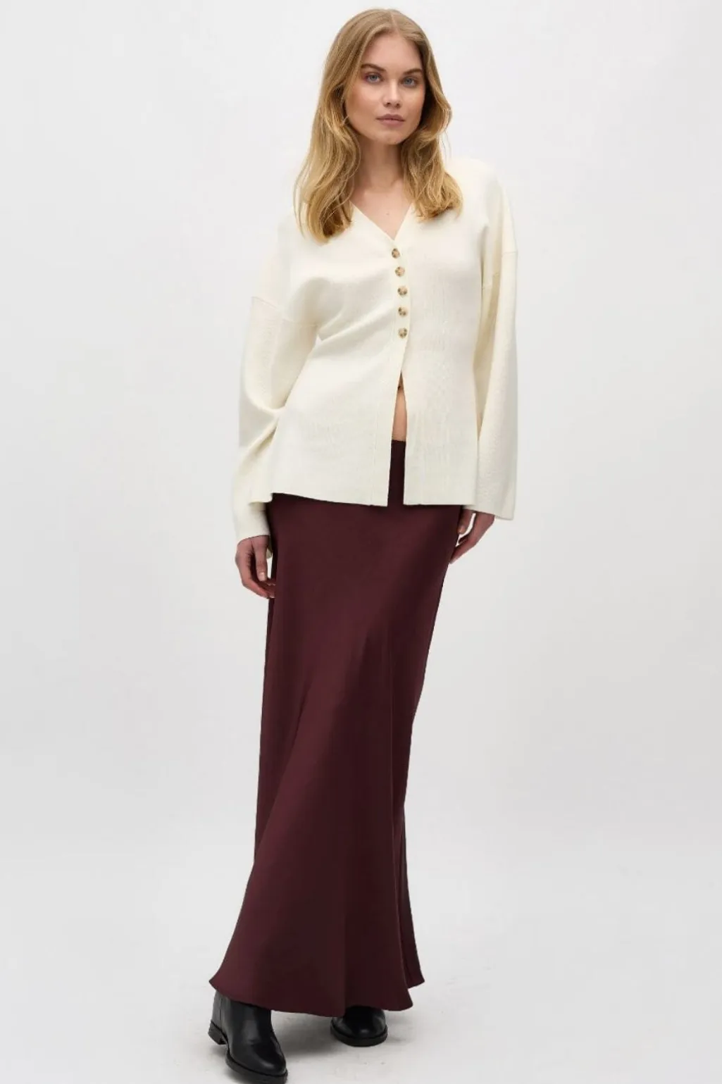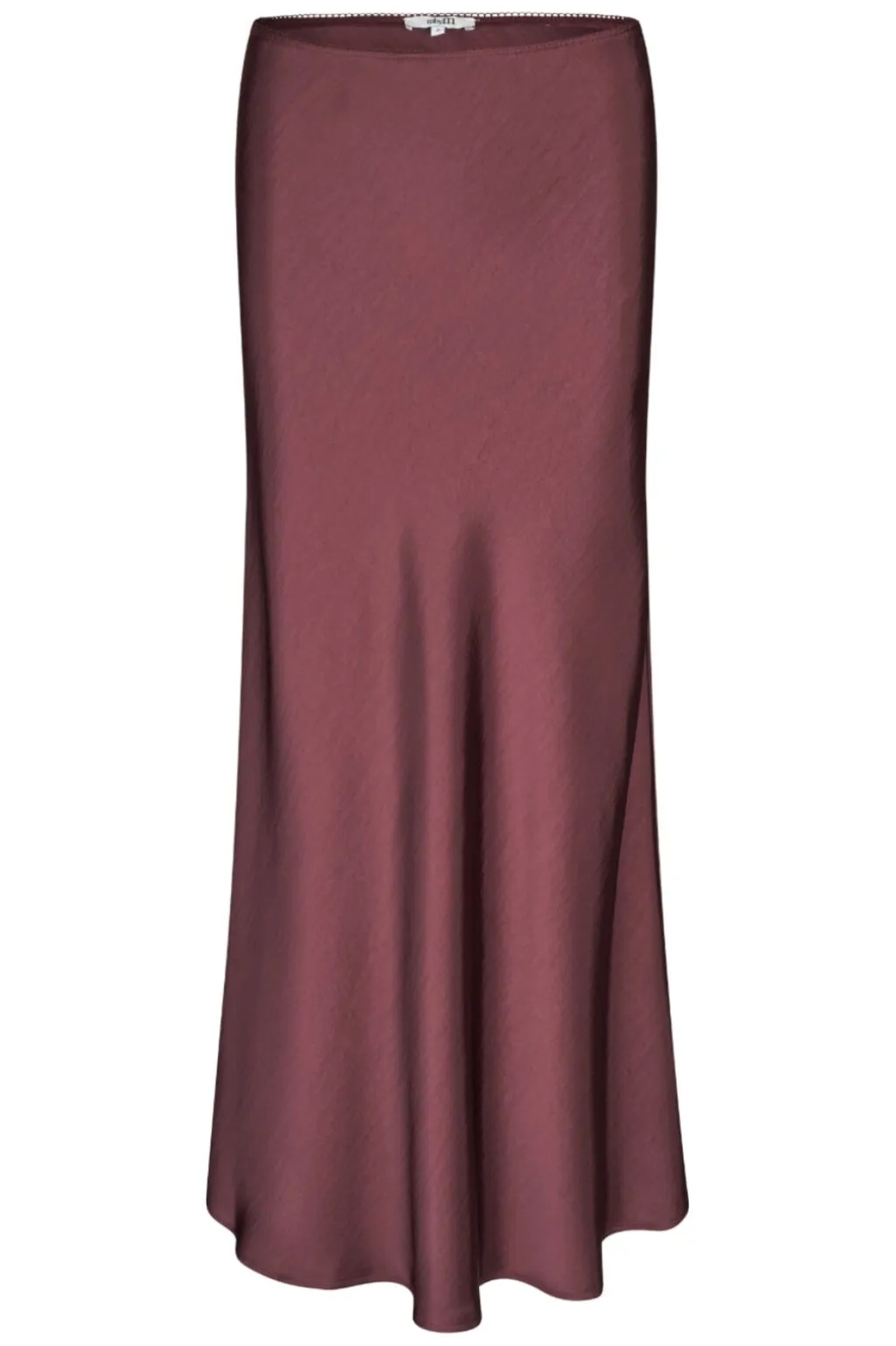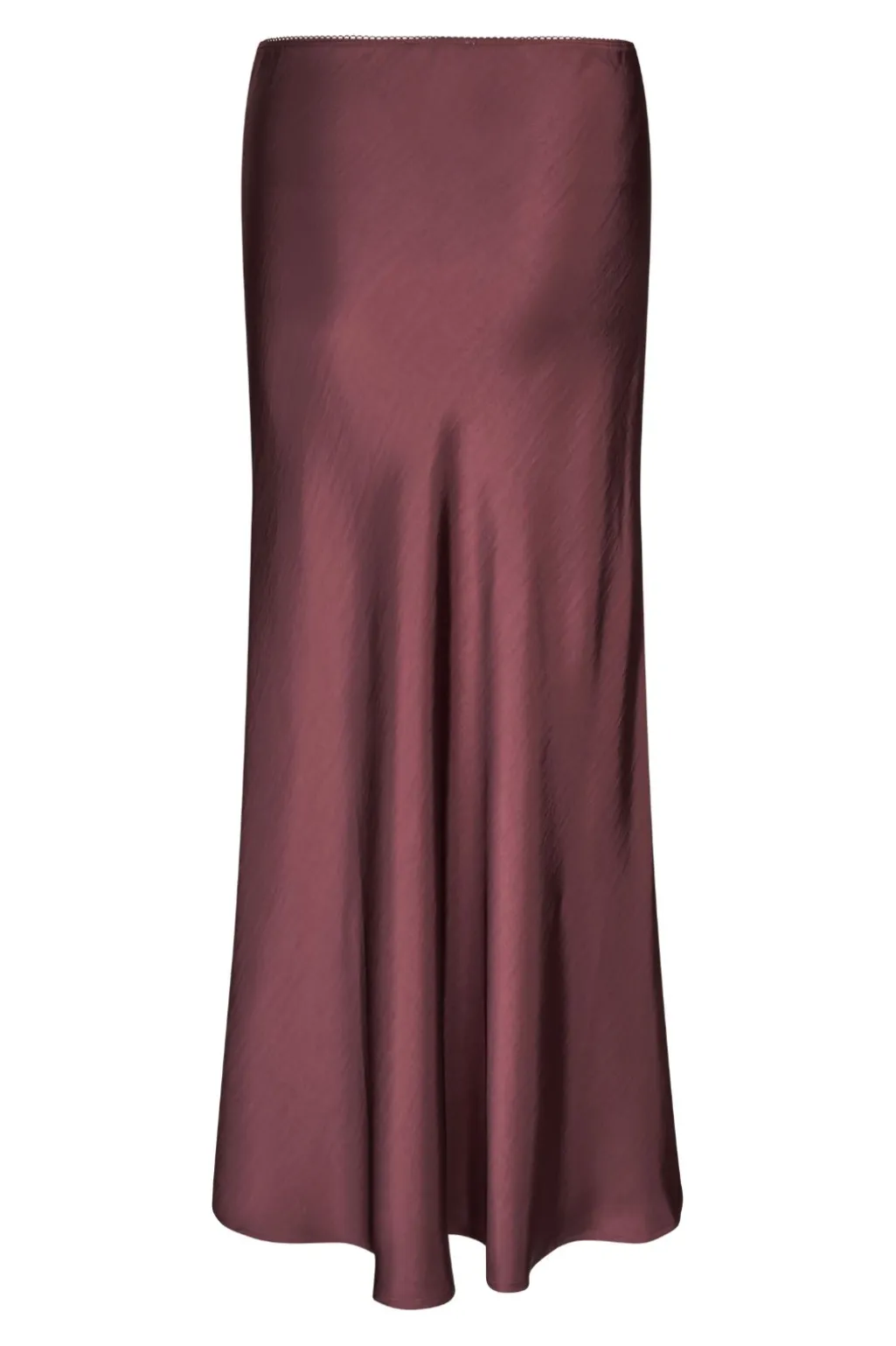 Gulvlang nederdel fra MbyM i en dyb bordeauxfarve. Den glatte tekstur og flydende silhuet gør den brugbar til både hverdag og fest.