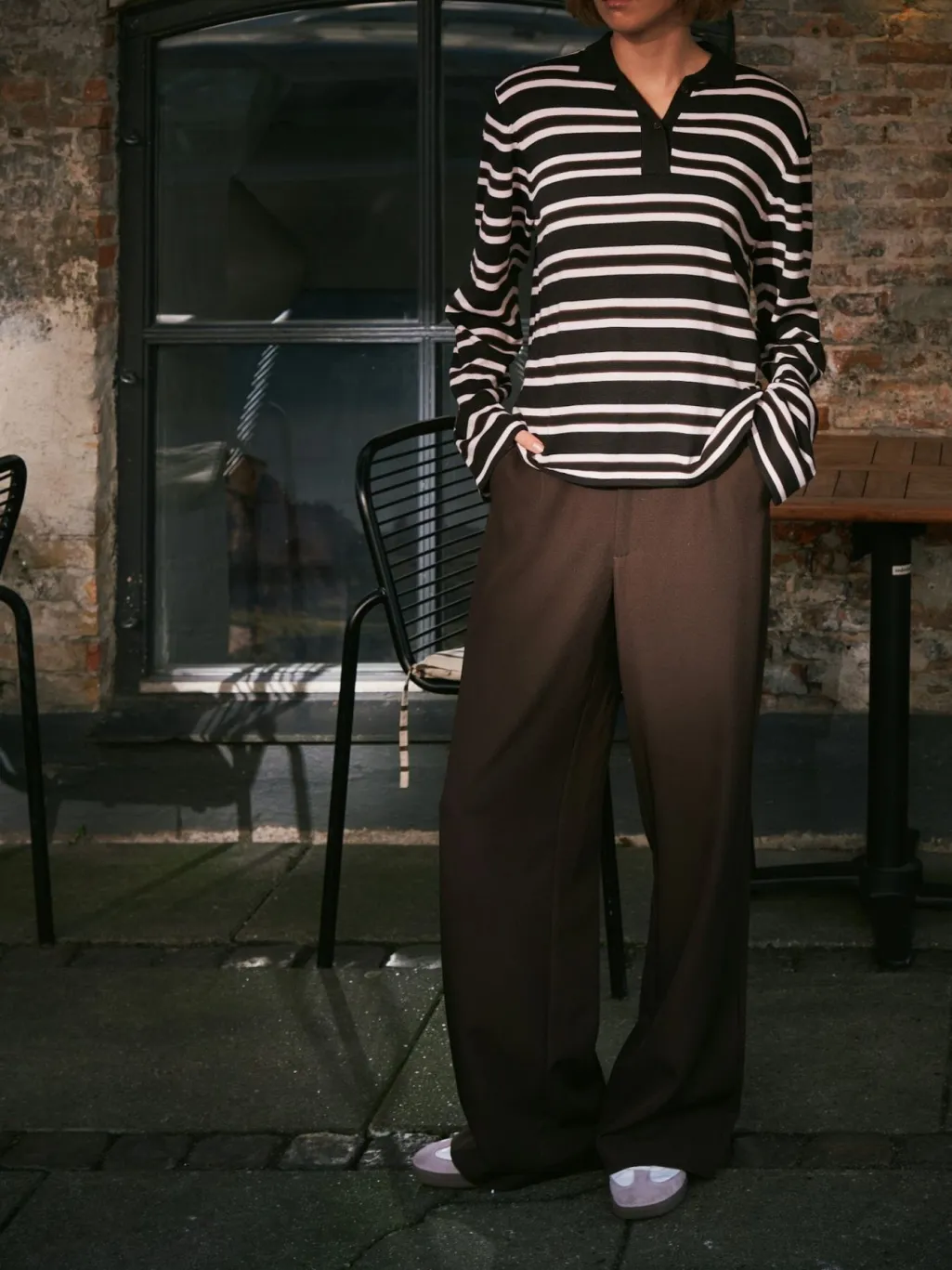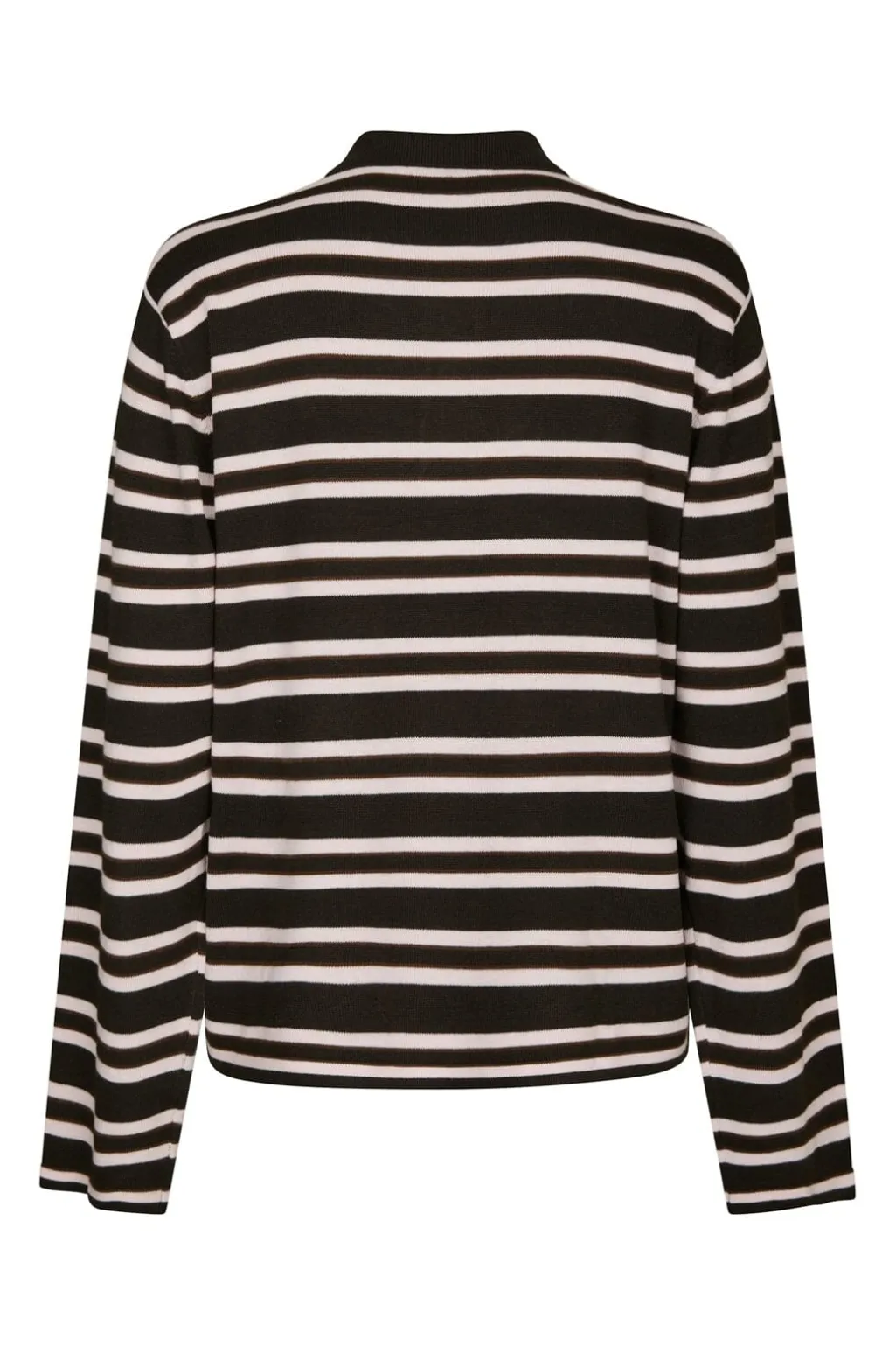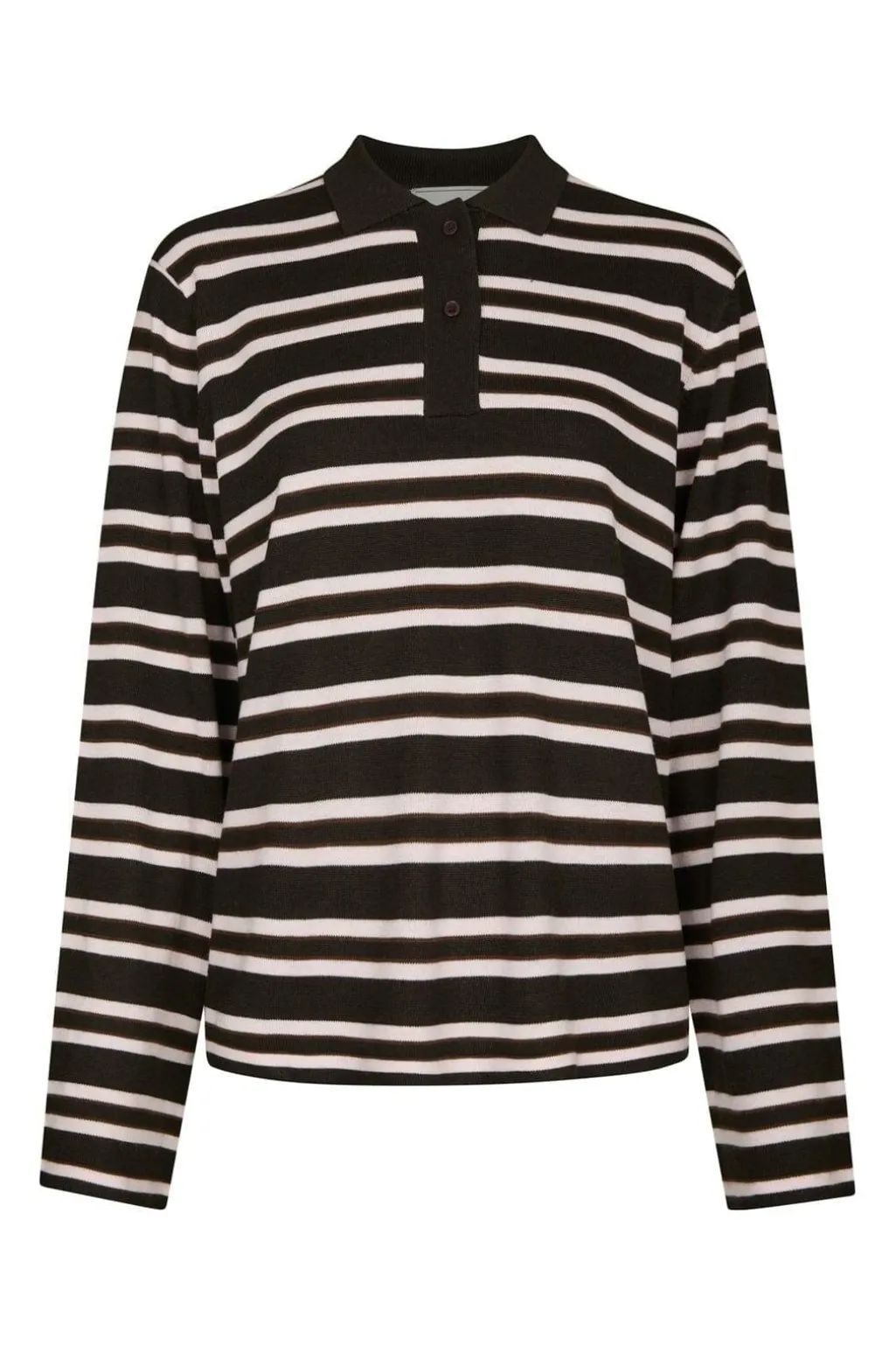 Mørkebrun strikbluse fra Neo Noir med vandrette striber i hvid. Blusen har en polo-krave med knaplukning og lange ærmer.
