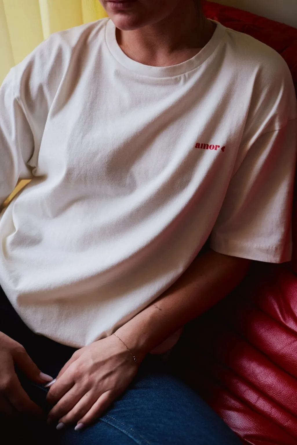 Hvid t-shirt fra Neo Noir med rød broderet tekst. På forsiden står amor diskret broderet, mens bagsiden har et større mucho amor-design. T-shirten har en almindelig pasform.