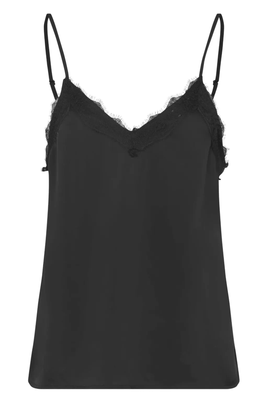 Sort top i satinmateriale med blondedetaljer langs V-udskæringen. De tynde stropper og det bløde stof giver toppen et let og enkelt udtryk.