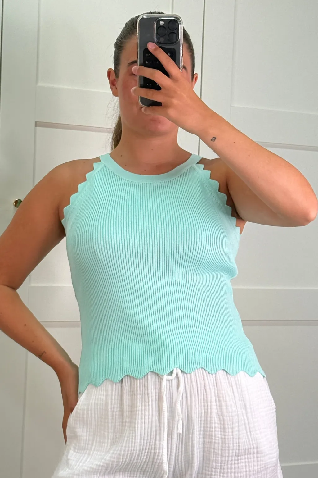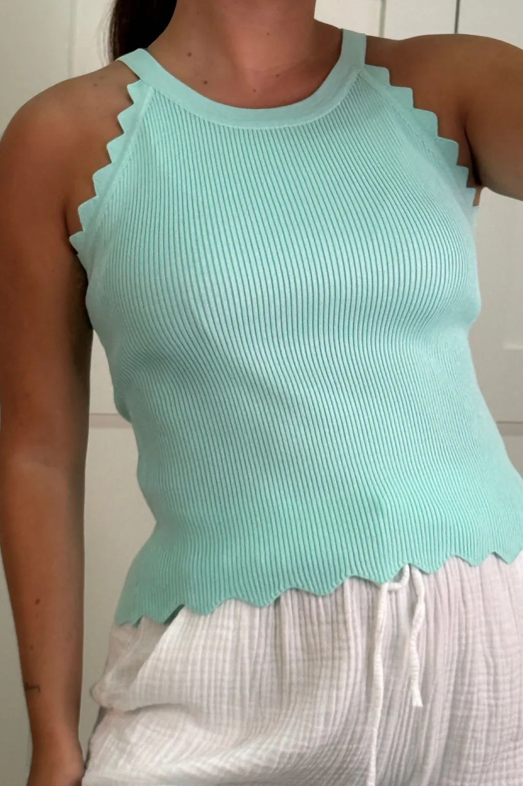 En lyseblå top fra A-bee, lavet af viskose og polyester. Toppen har en ribbet struktur og bølgede kanter ved ærmegabene og nederste kant.