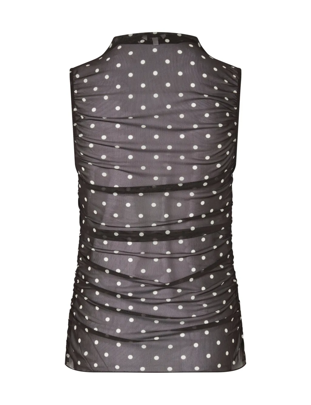 Ærmeløs top fra MbyM med polkaprikket mønster. Toppen er sort med hvide prikker og har rynkedetaljer langs siderne.