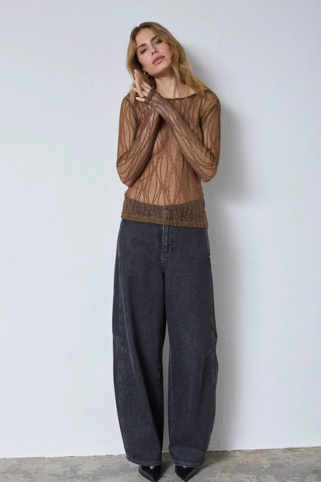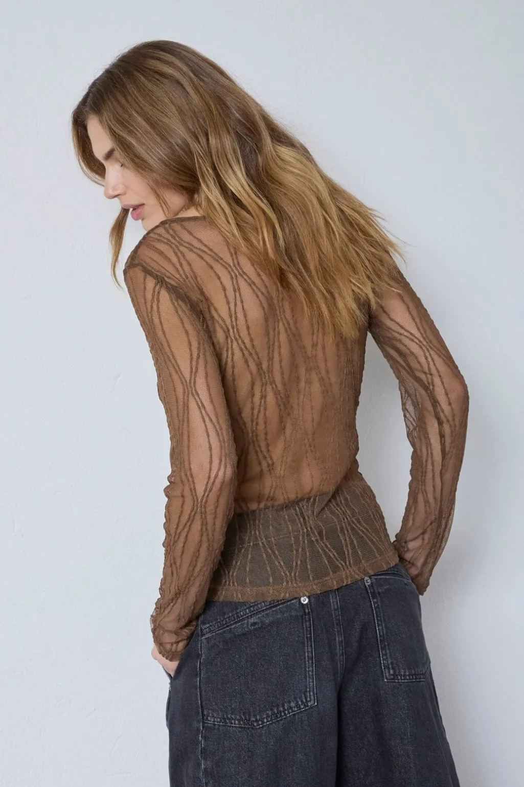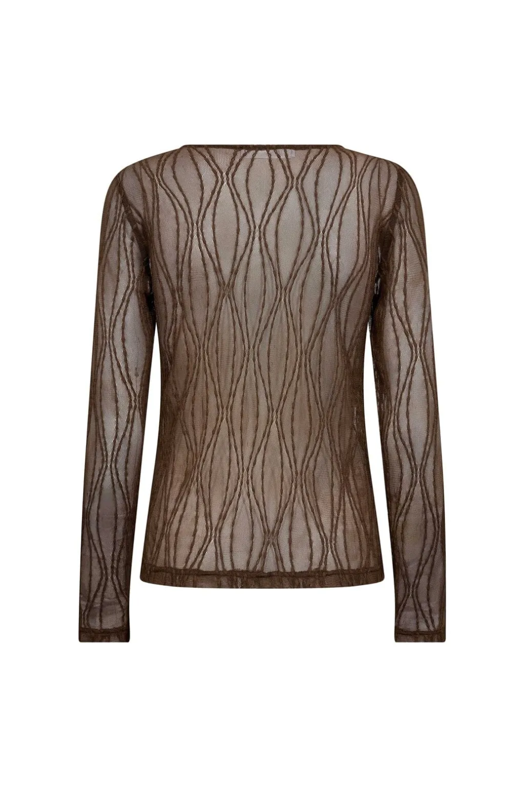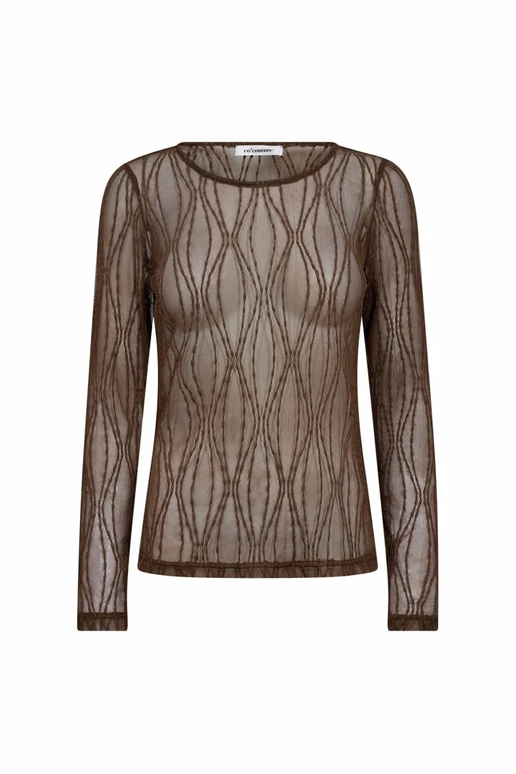 Brun mesh-bluse fra Co´Couture med broderi og et gennemsigtigt design. Blusen har slim fit, lange ærmer og rund halsudskæring.