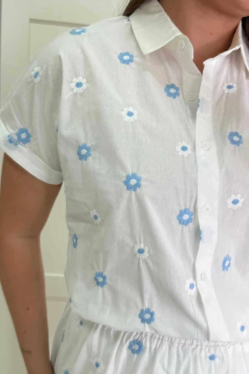 Hvid skjorte fra A-bee med lyseblå blomsterbroderi. Skjorten har en klassisk skjortekrave, korte ærmer og en elastisk talje, der giver en god pasform.