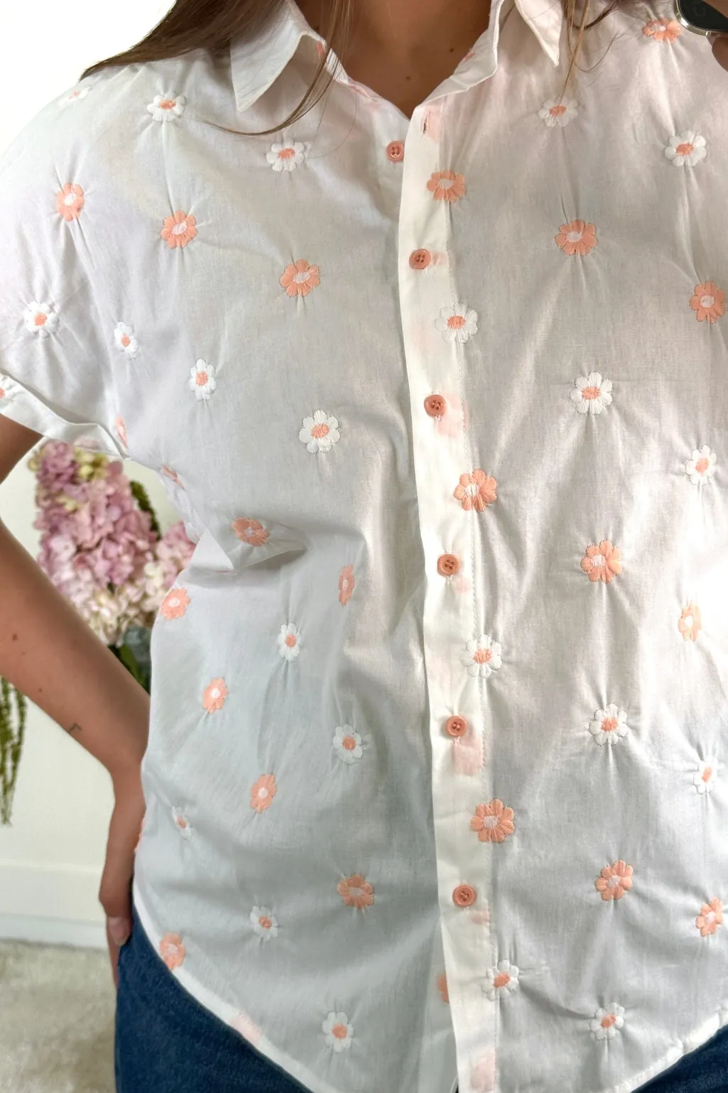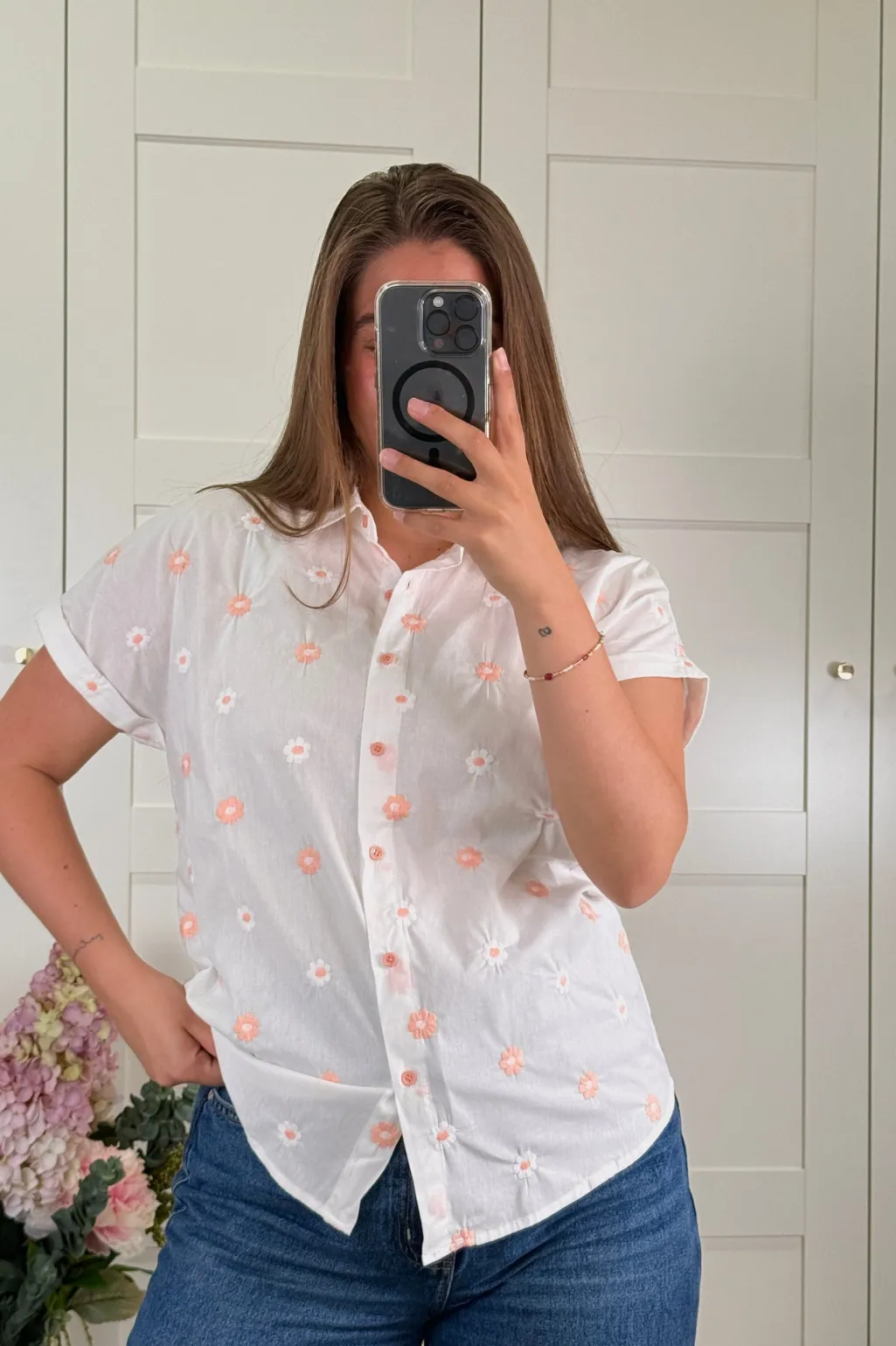 Hvid skjorte fra A-bee med broderede blomster i abrikos og hvid. Skjorten har korte ærmer, skjortekrave og knaplukning foran.