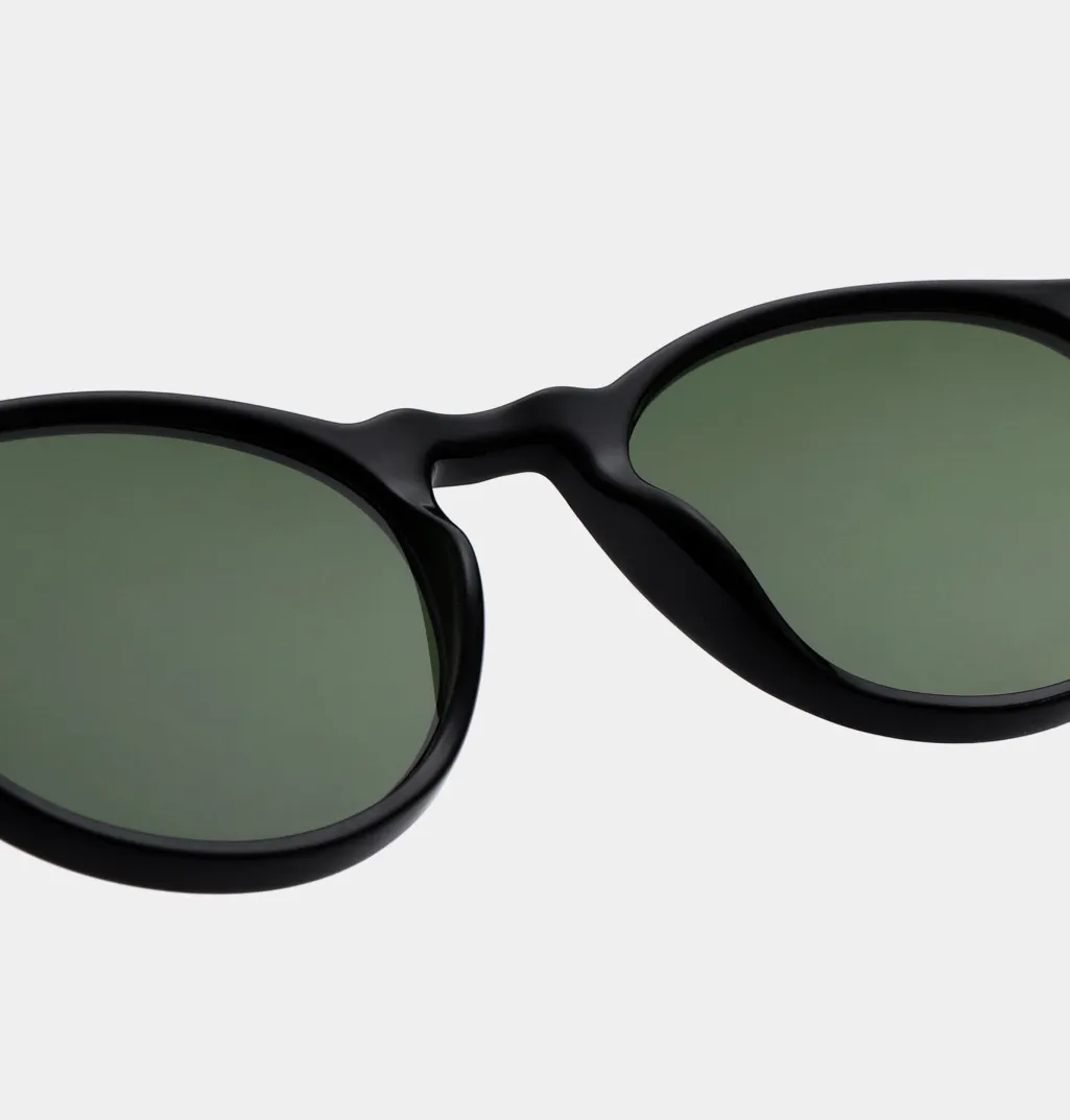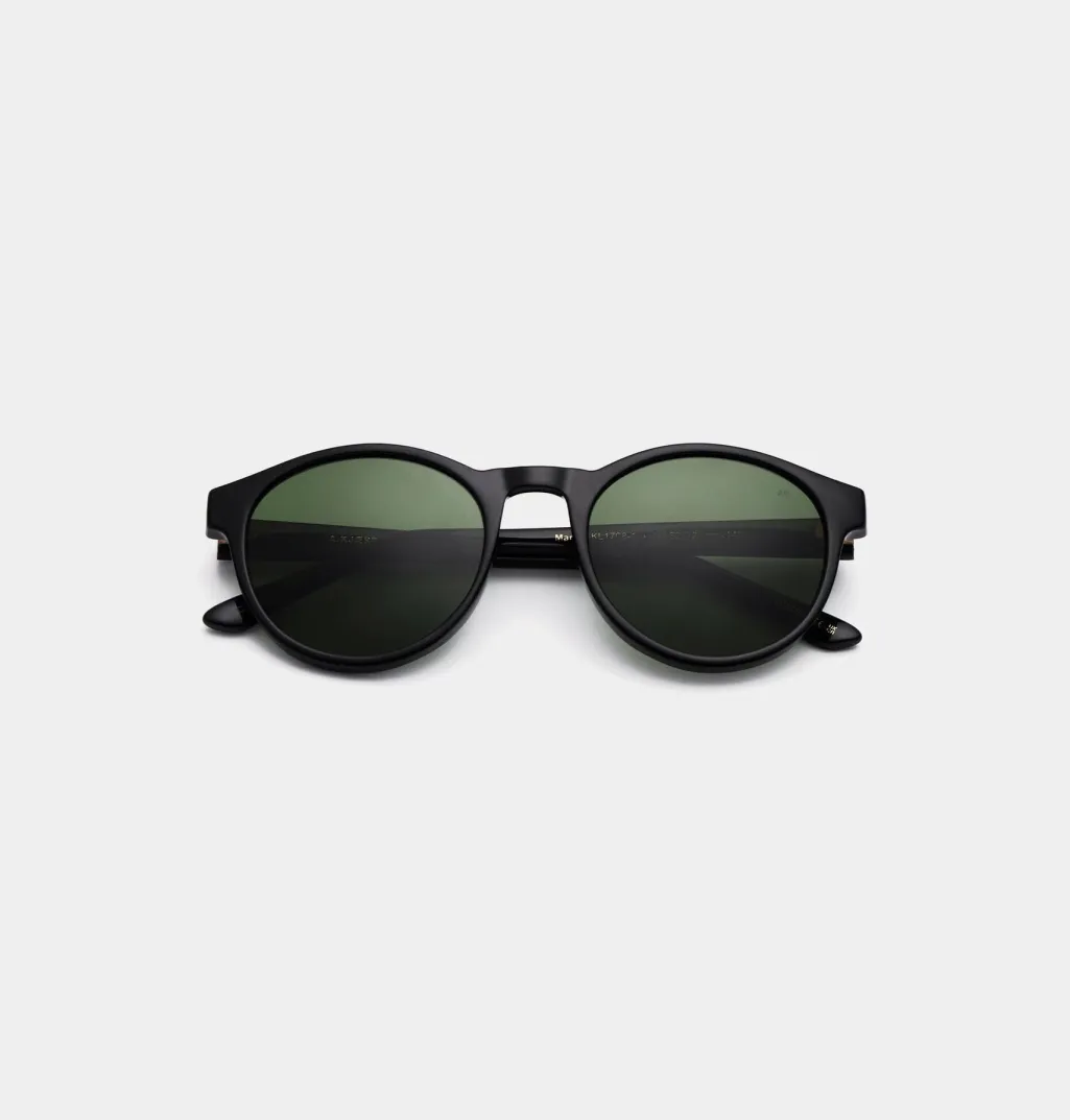 Sorte solbriller fra A. Kjærbede med rund form og mørkegrønne linser. Solbrillerne har UV 400-beskyttelse og formbare stænger med metalkerner til individuel tilpasning.
