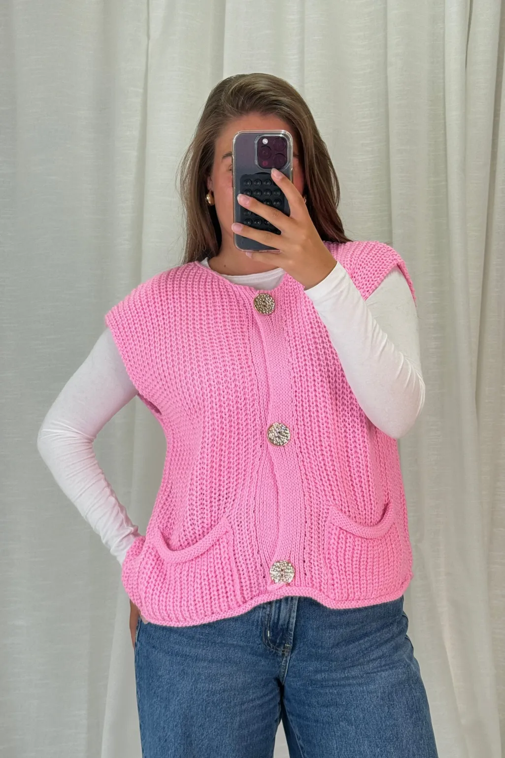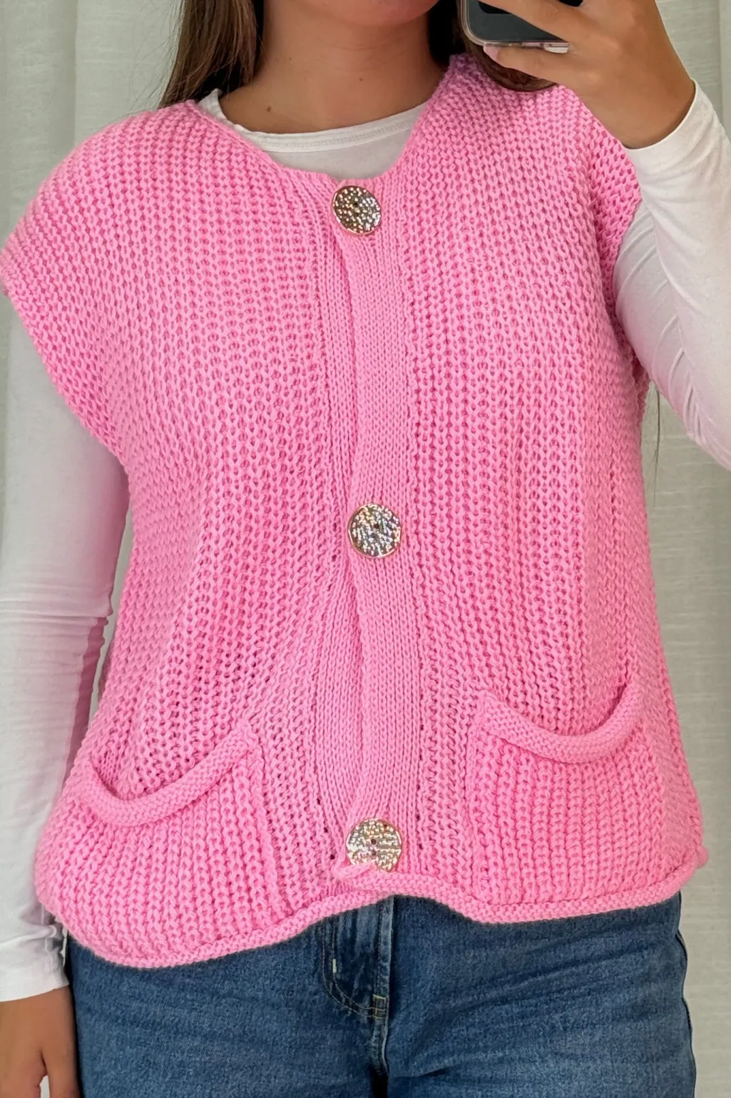Pink vest fra A-bee. Vesten er lavet af strikket akryl og har pailletter på knapperne. Den har en løs pasform og rund hals.