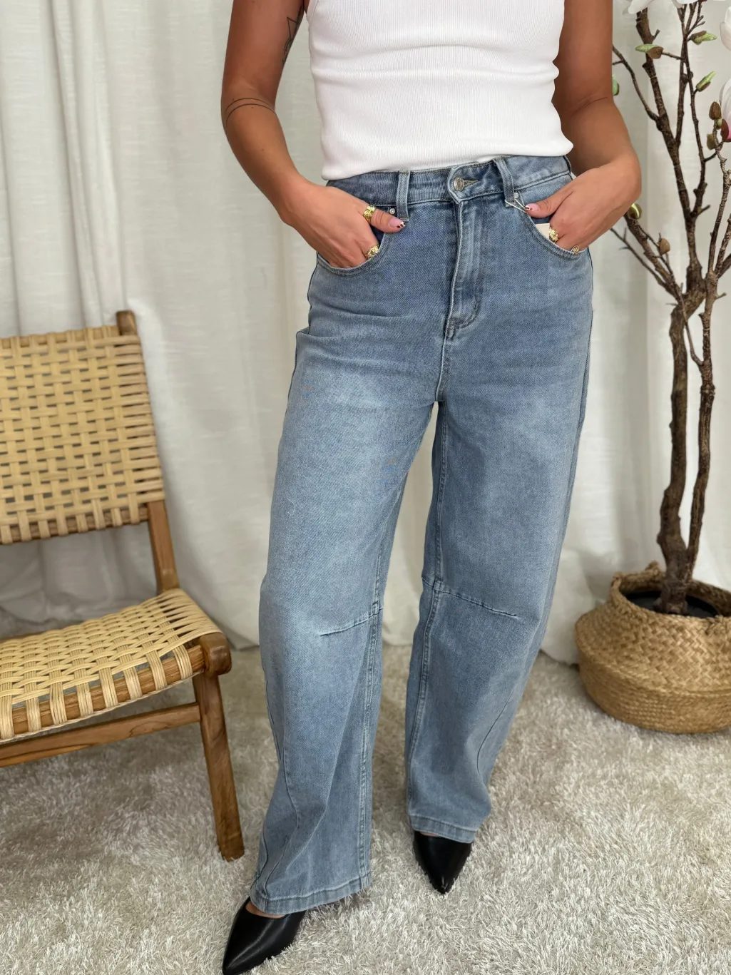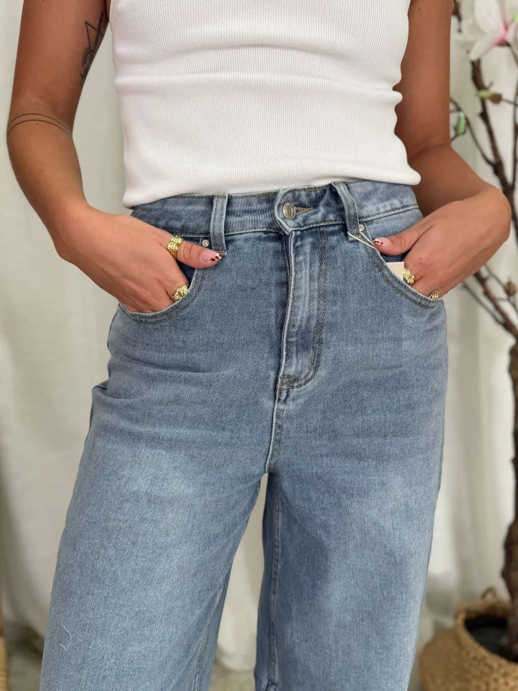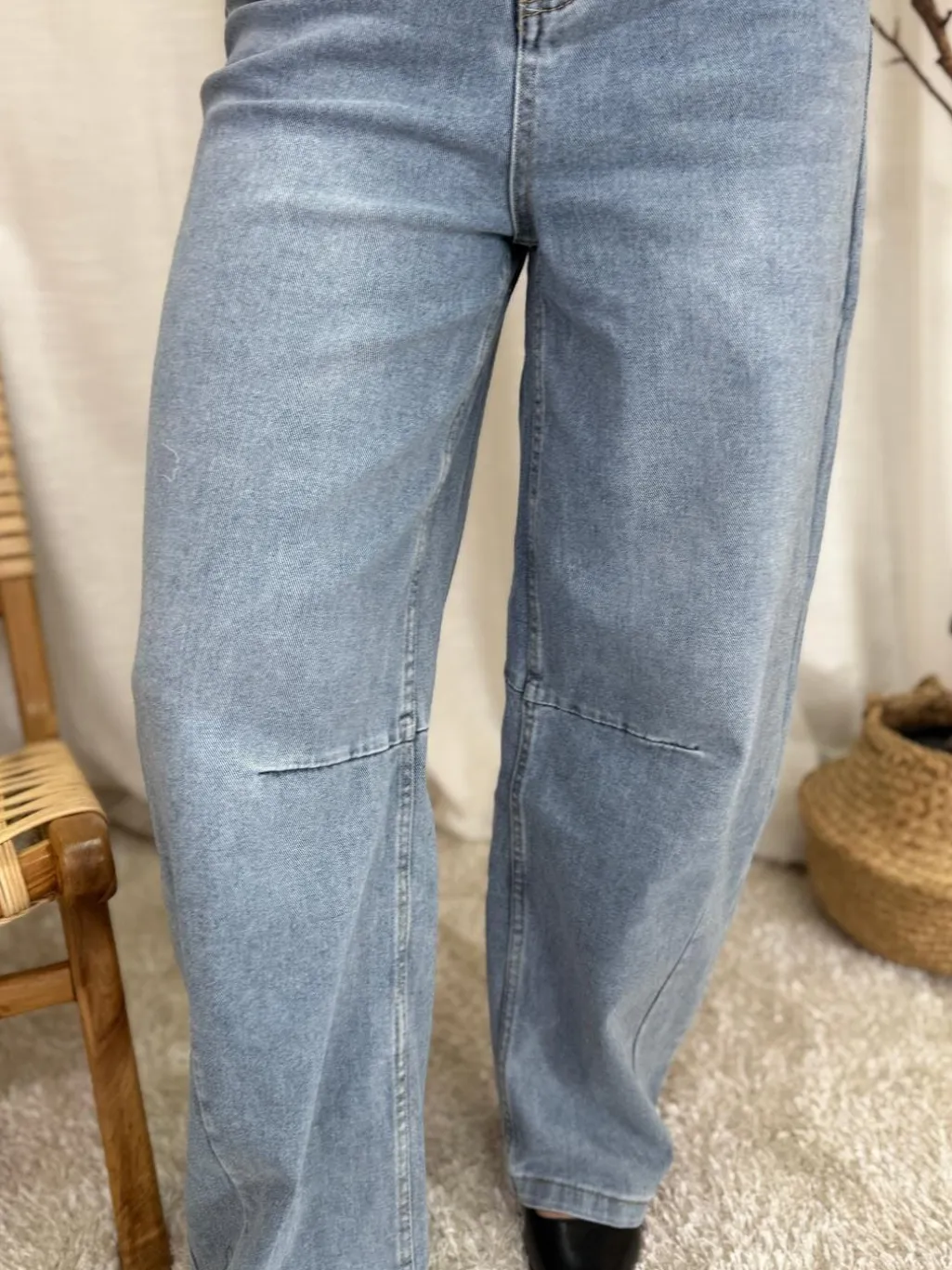 Denimbukser fra A-bee med høj talje og brede ben. De har en medium blå farve og en regular fit-pasform, der giver god bevægelsesfrihed.