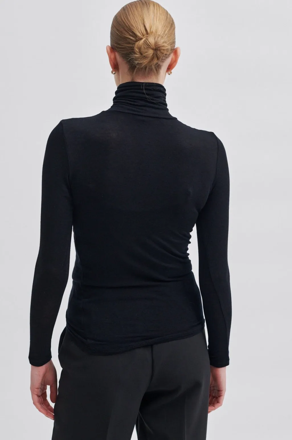 Sort rullekrave T-shirt fra Second Female. Trøjen har en tætsiddende pasform og er lavet af en merinoblanding med lyocell og elastan.