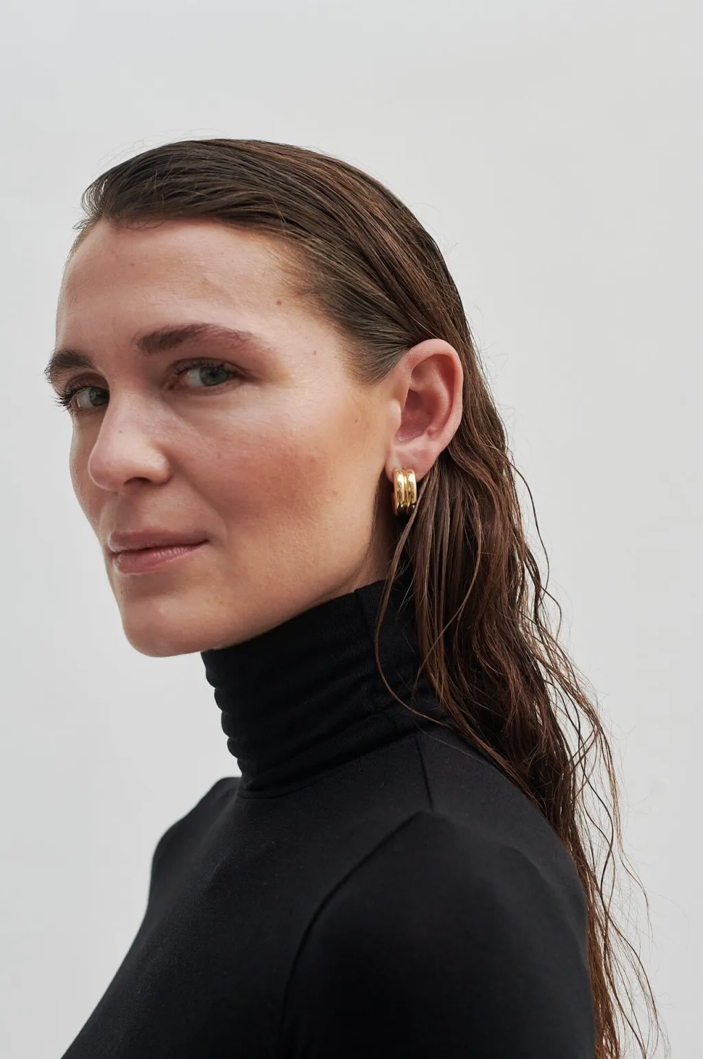 - Høj halsudskæring med rullekrave