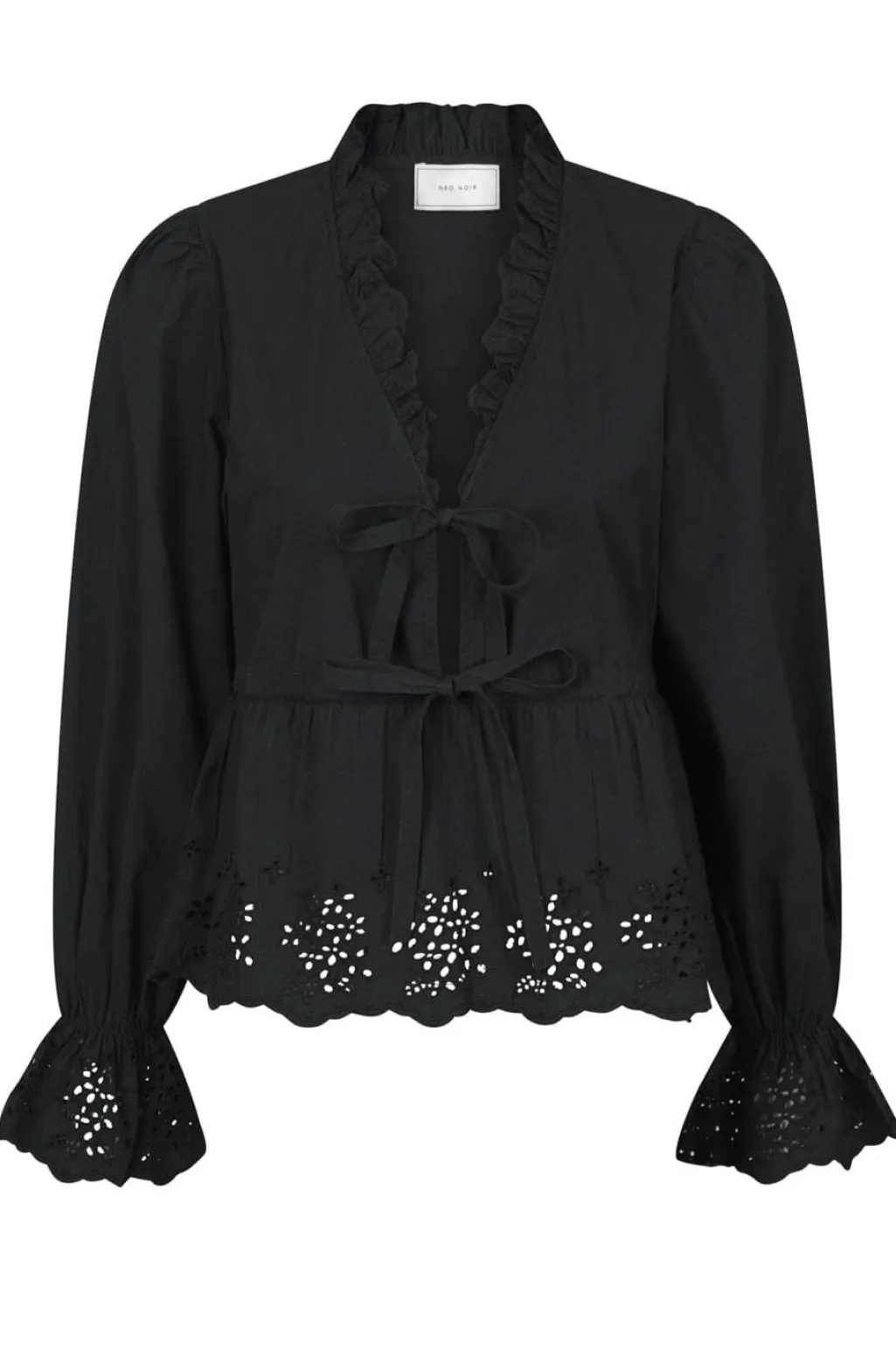 Sort bluse fra Neo Noir med broderede kanter og flæsedetaljer. V-halsudskæring med snøredetaljer foran og lange ærmer med rynkede manchetter.