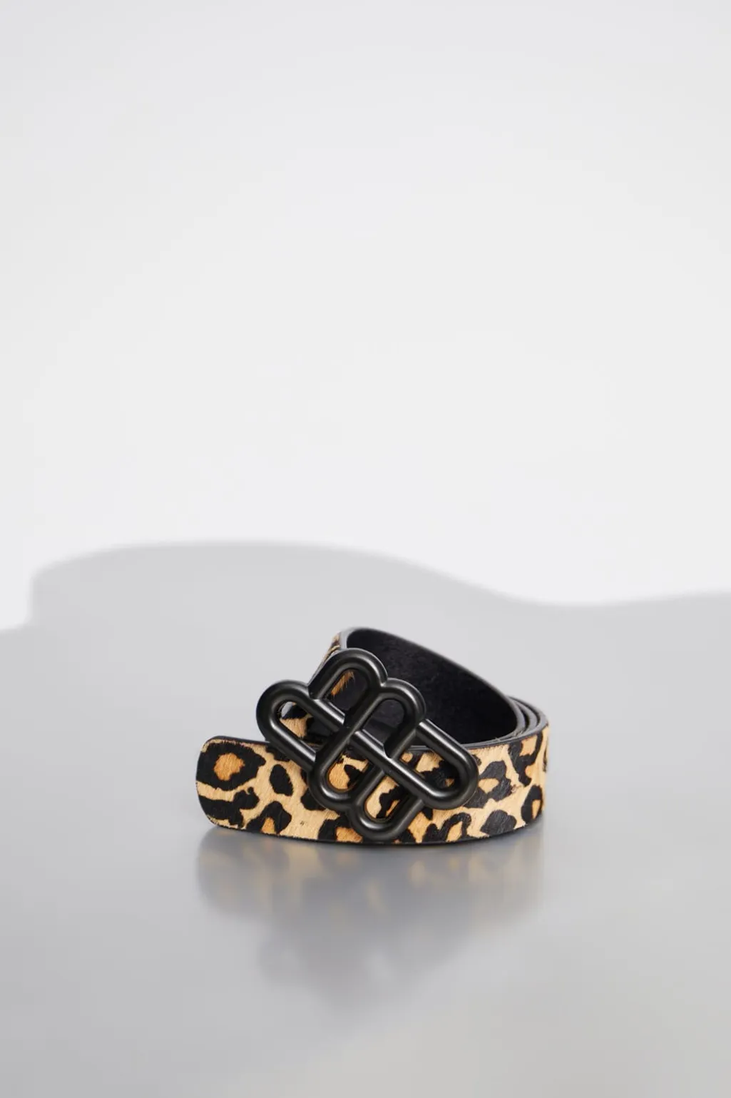 Brunt bælte fra Munthe med leopardmønster. Den sorte spænde har et Munthe-emblem, og bæltet er lavet af kolæder med naturlig hårstruktur. Bæltet kan styles til både afslappede og pæne outfits.