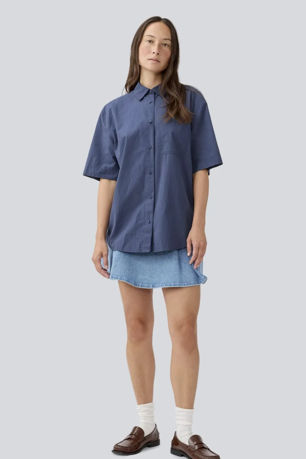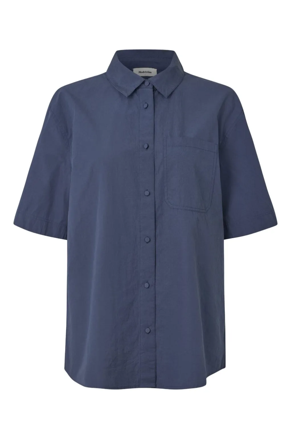 Kortærmet skjorte fra Modström i blå ombre-farve. Skjorten har en klassisk krave og knapper hele vejen ned. Den blå farve går fra mørk til lys i en flydende overgang.
