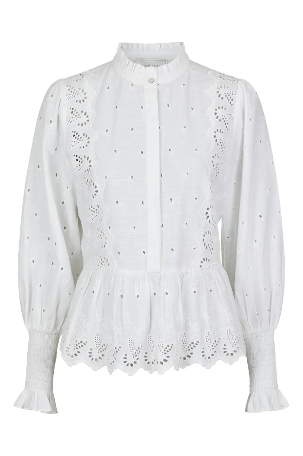 Hvid bluse fra Neo Noir med broderede detaljer. Blusen har en peplum-stil med bølget kant og skjortekrave. Knapperne foran gør den nem at tage på.
